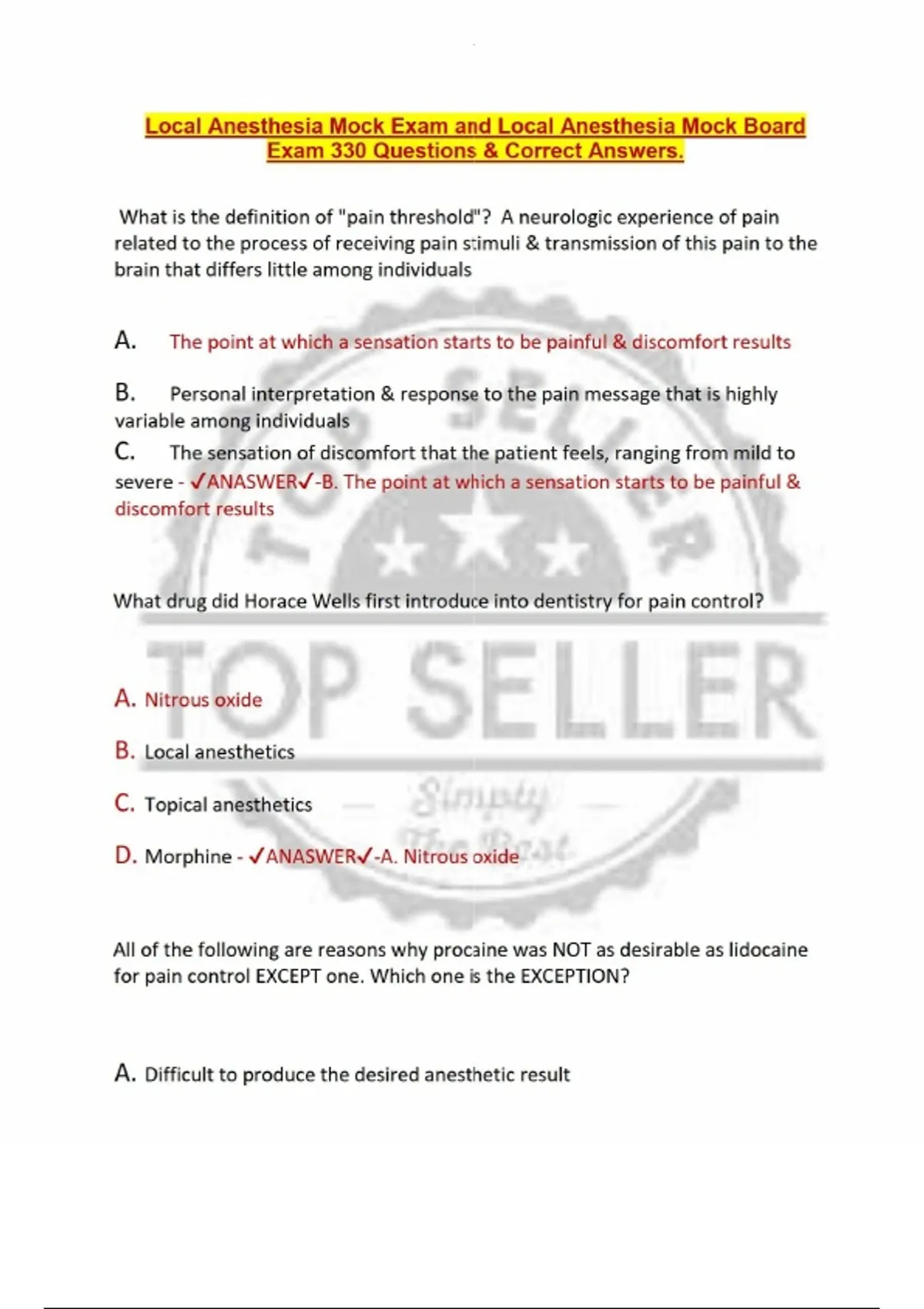 Local Anesthesia Mock Exam and Local Anesthesia Mock Board Exam 330 Questions & Correct Answers.