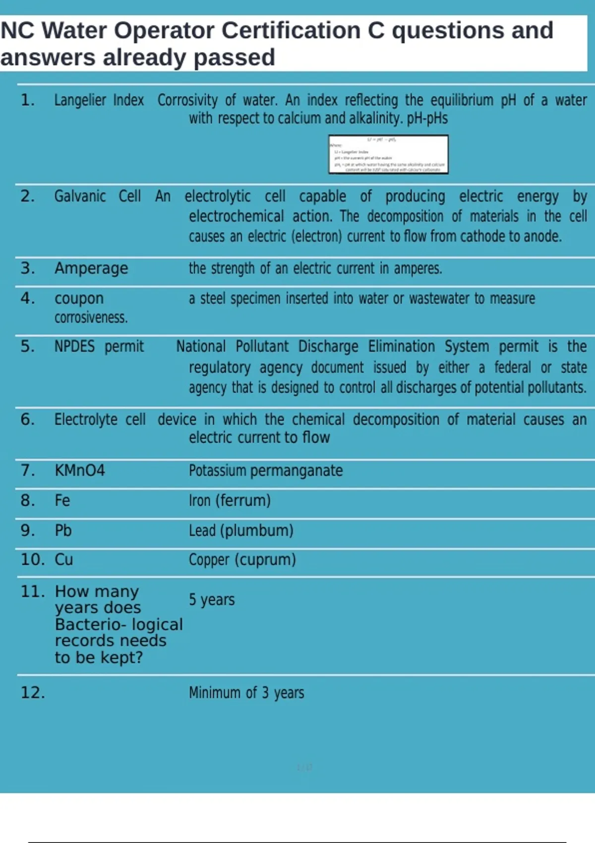 1. Langelier Index Corrosivity of water. An index reflecting the equilibrium pH of a water