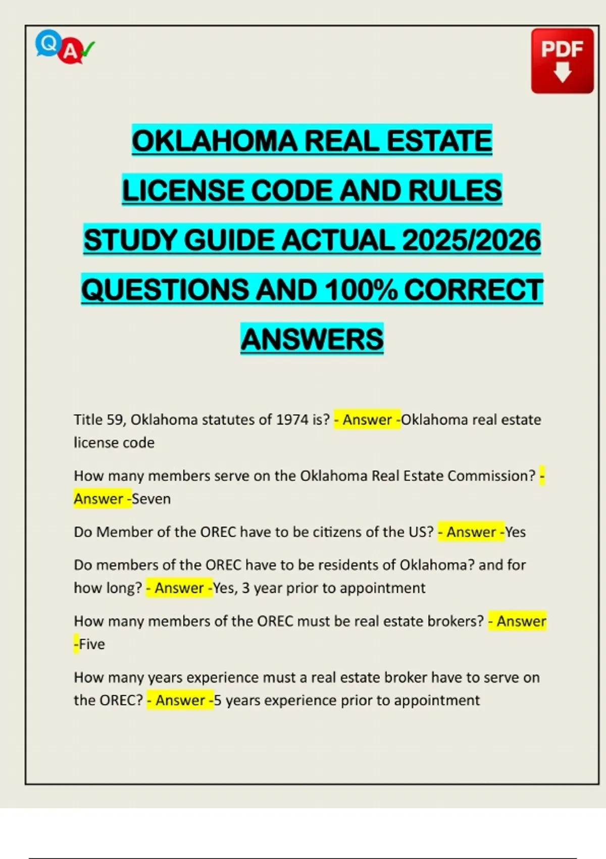 OKLAHOMA REAL ESTATE LICENSE CODE AND RULES STUDY GUIDE ACTUAL 2025/2026 QUESTIONS AND 100% CORRECT ANSWERS Title 59, Oklahoma statutes of 1974 is? - Answer -Oklahoma real estate license code How many members serve on the Oklahoma Real Estate Commission? - Answer -Seven Do Member of the OREC have to be citizens of the US? - Answer -Yes Do members of the OREC have to be residents of Oklahoma? and for how long? - Answer -Yes, 3 year prior to appointment How many members of the OREC must be real estate brokers? - Answer -Five