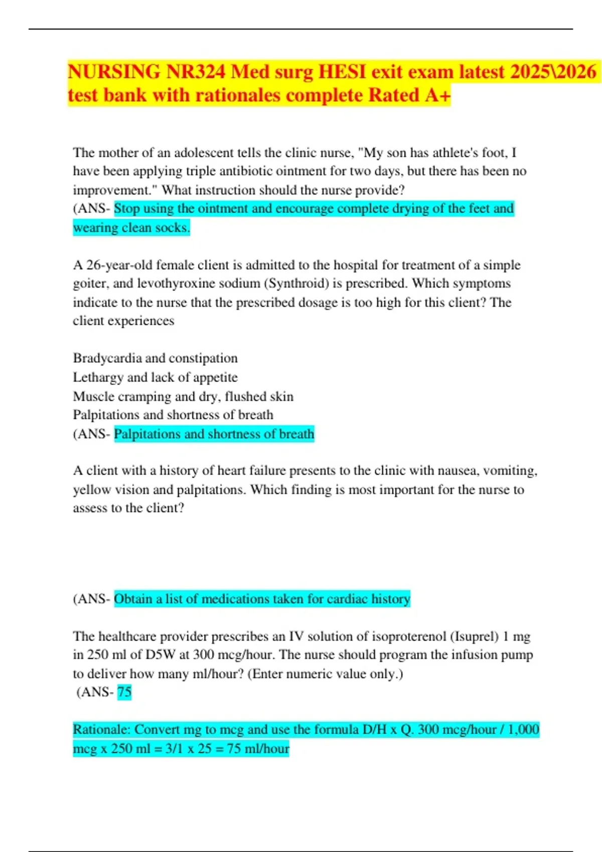 This document contains the latest test bank for the NR324 Medical-Surgical HESI Exit Exam, updated for the 2025/2026 academic year. It includes comprehensive exam-style questions with detailed rationales, ensuring clear understanding of the correct answers. Covering essential med-surg topics such as cardiovascular, respiratory, renal, endocrine, gastrointestinal, neurological, and integumentary systems, it is a complete and high-quality study resource for nursing students aiming for top performance on the HESI Exit exam.