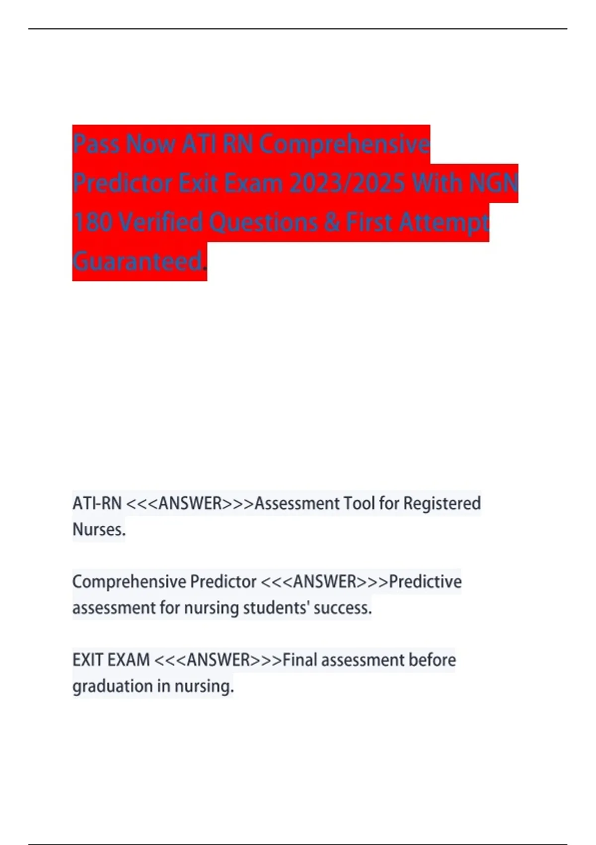 Pass Now ATI RN Comprehensive Predictor Exit Exam 2023/2025 With NGN 180 Verified QuestioPass Now ATI RN Comprehensive Predictor Exit Exam 2023/2025 With NGN 180 Verified Questions & First Attempt G & First AttePass Now ATI RN Comprehensive Predictor Exit Exam 2023/2025 With NGN 180 Verified Questions & First Attempt G Guaranteed.