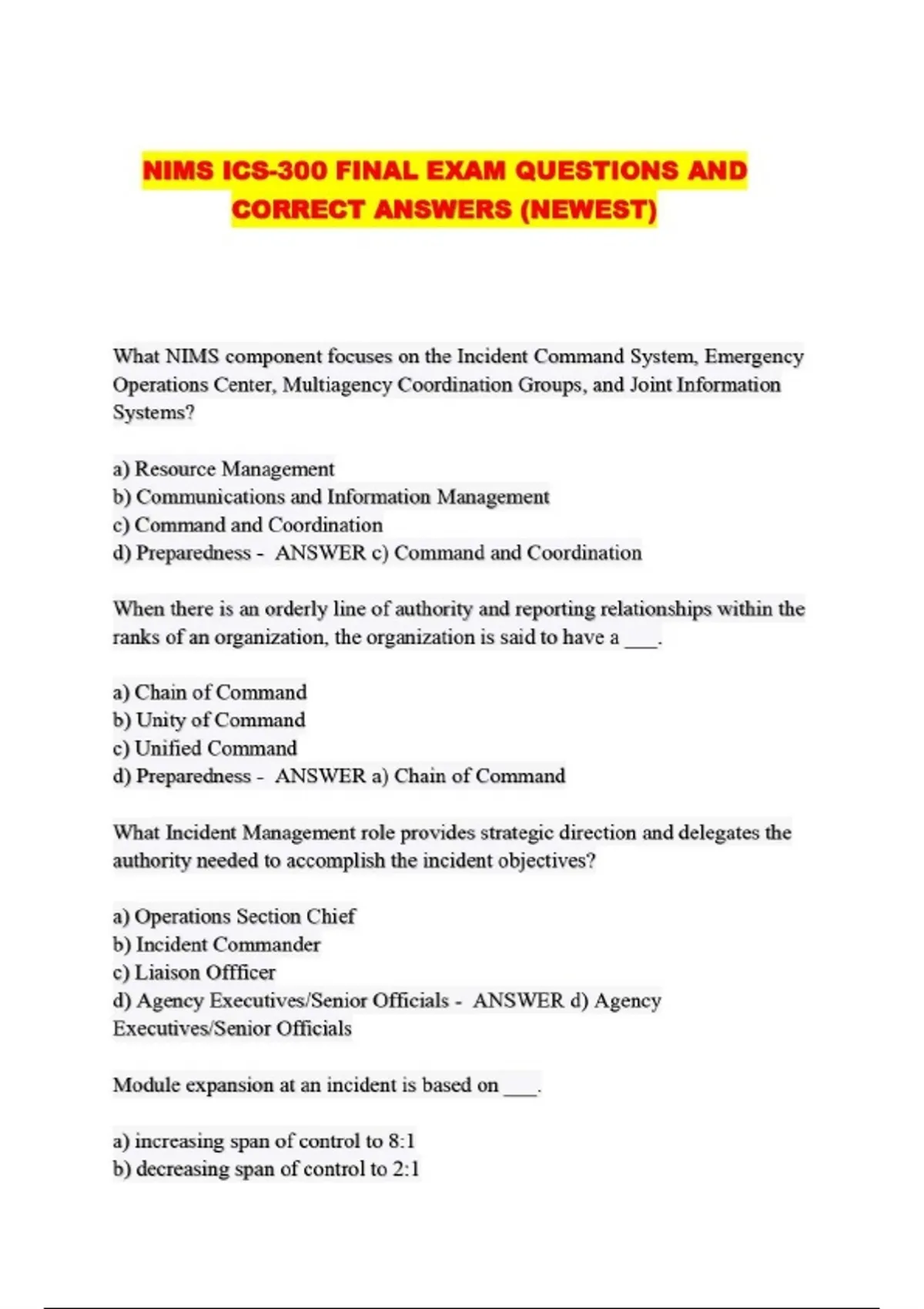 NIMS ICS-300 FINAL EXAM QUESTIONS AND CORRECT ANSWERS (NEWEST)...