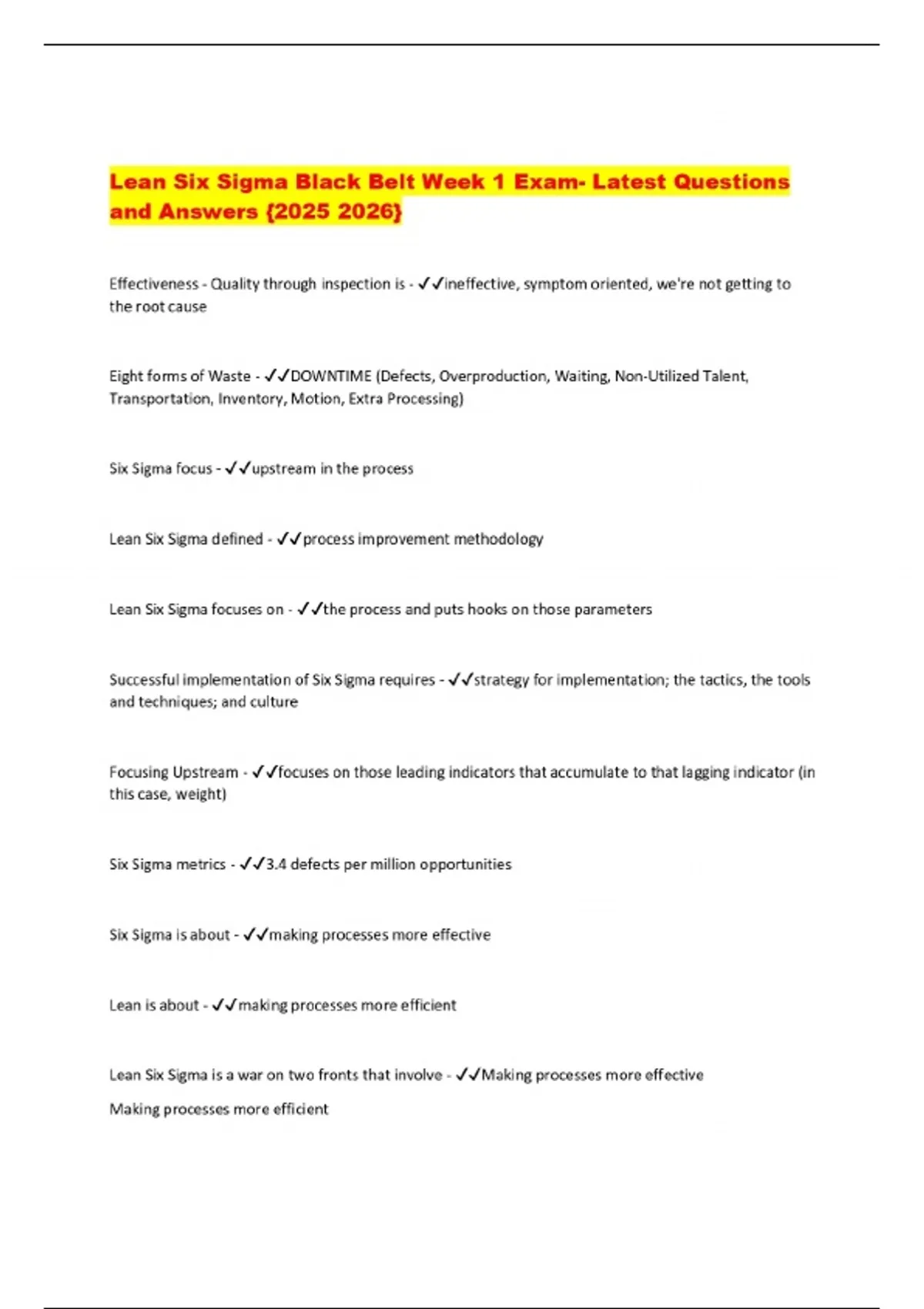 Lean Six Sigma Black Belt Week 1 Exam- Latest Questions and Answers {}