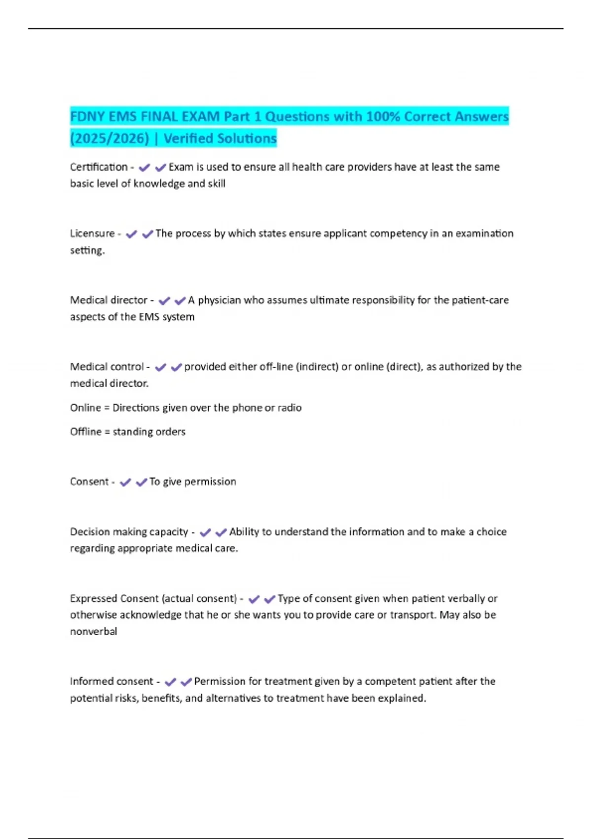 FDNY EMS FINAL EXAM Part 1 Questions with 100% Correct Answers (2025/2026) | Verified Solutions