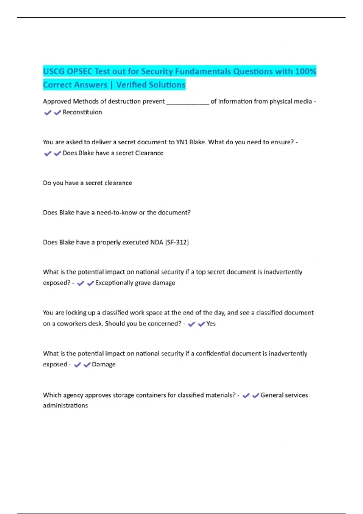 USCG OPSEC Test out for Security Fundamentals Questions with 100% Correct Answers | Verified Solutions