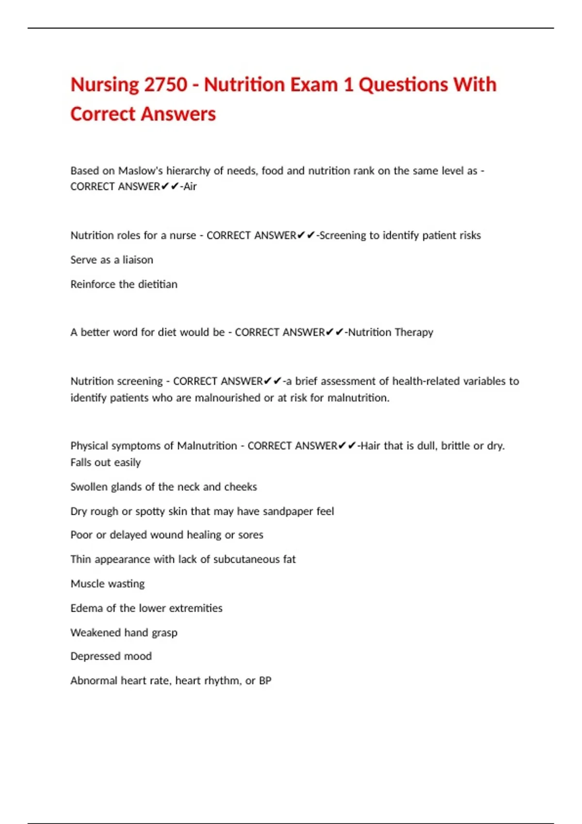 Physical |symptoms |of |Malnutrition |- |CORRECT |ANSWER✔✔-Hair |that |is |dull, |brittle |or |dry. |