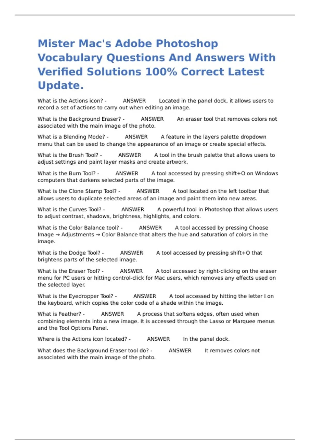 What is the Clone Stamp Tool? - ANSWER A tool located on the left toolbar that