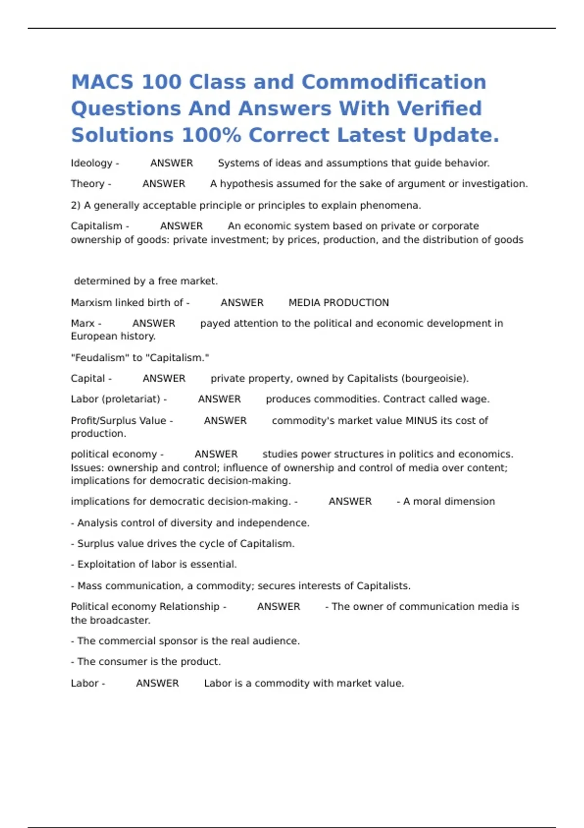 MACS 100 Class and Commodification Questions And Answers With Verified Solutions 100% Correct Latest Update.