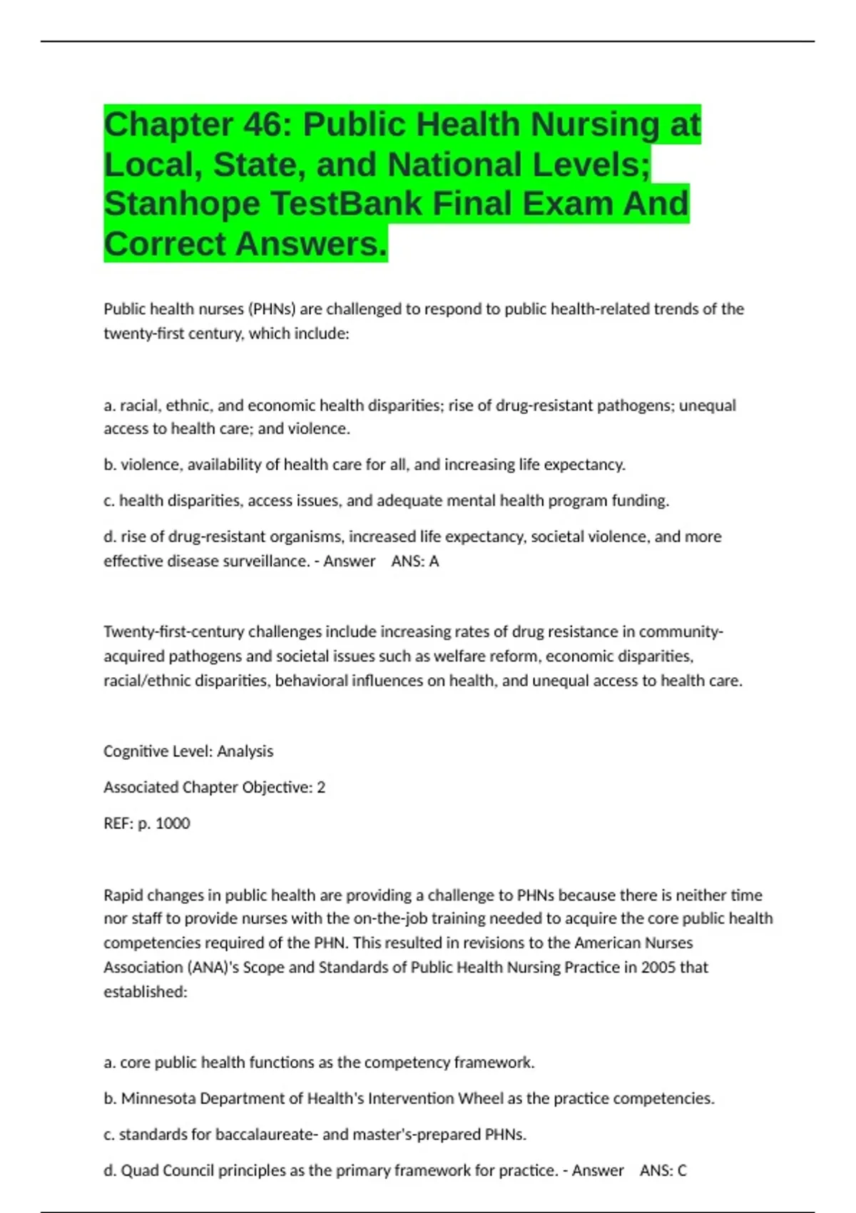 Chapter 46: Public Health Nursing at Local, State, and National Levels; Stanhope TestBank Final Exam And Correct Answers.