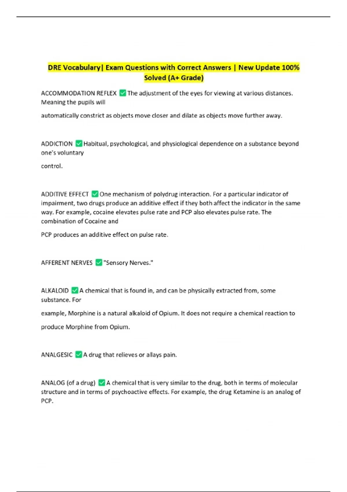 DRE Vocabulary| Exam Questions with Correct Answers | New Update 100% Solved (A+ Grade)