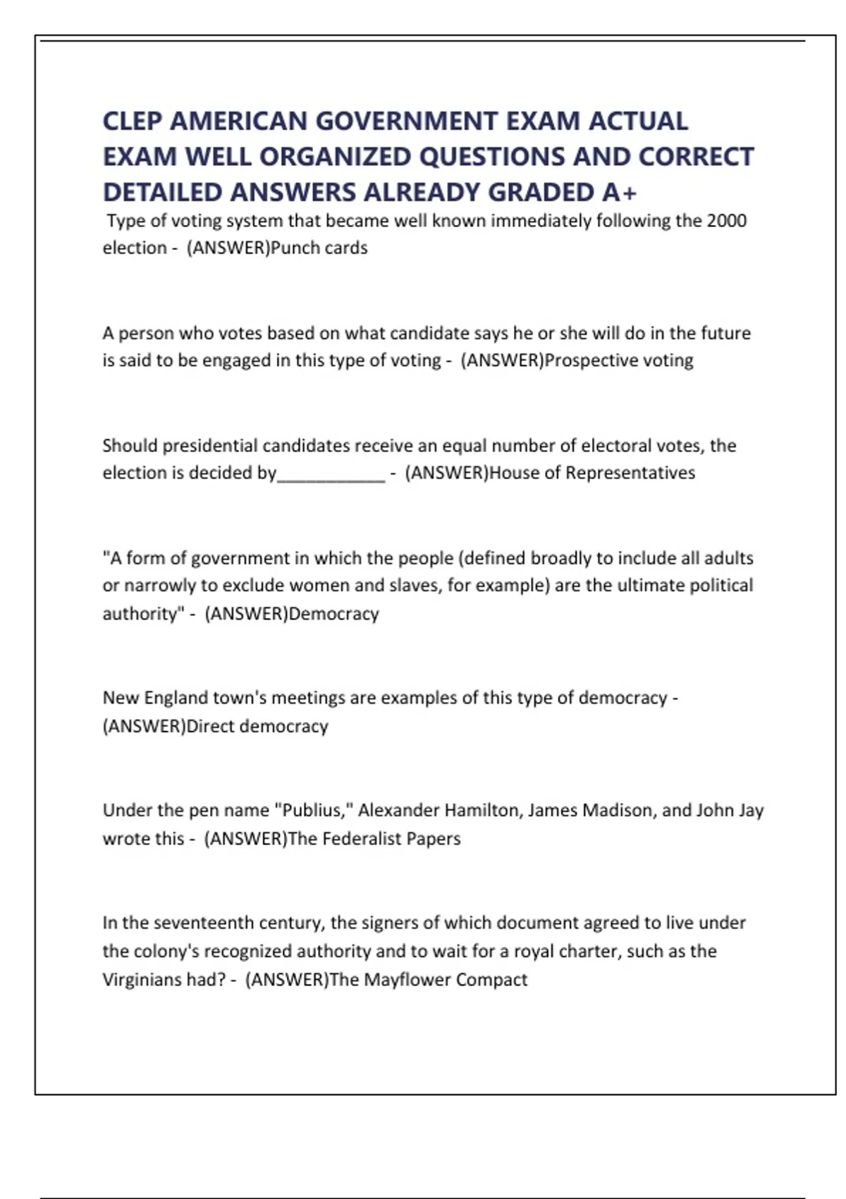 CLEP AMERICAN GOVERNMENT EXAM ACTUAL EXAM WELL ORGANIZED QUESTIONS AND CORRECT DETAILED ANSWERS ALREADY GRADED A+