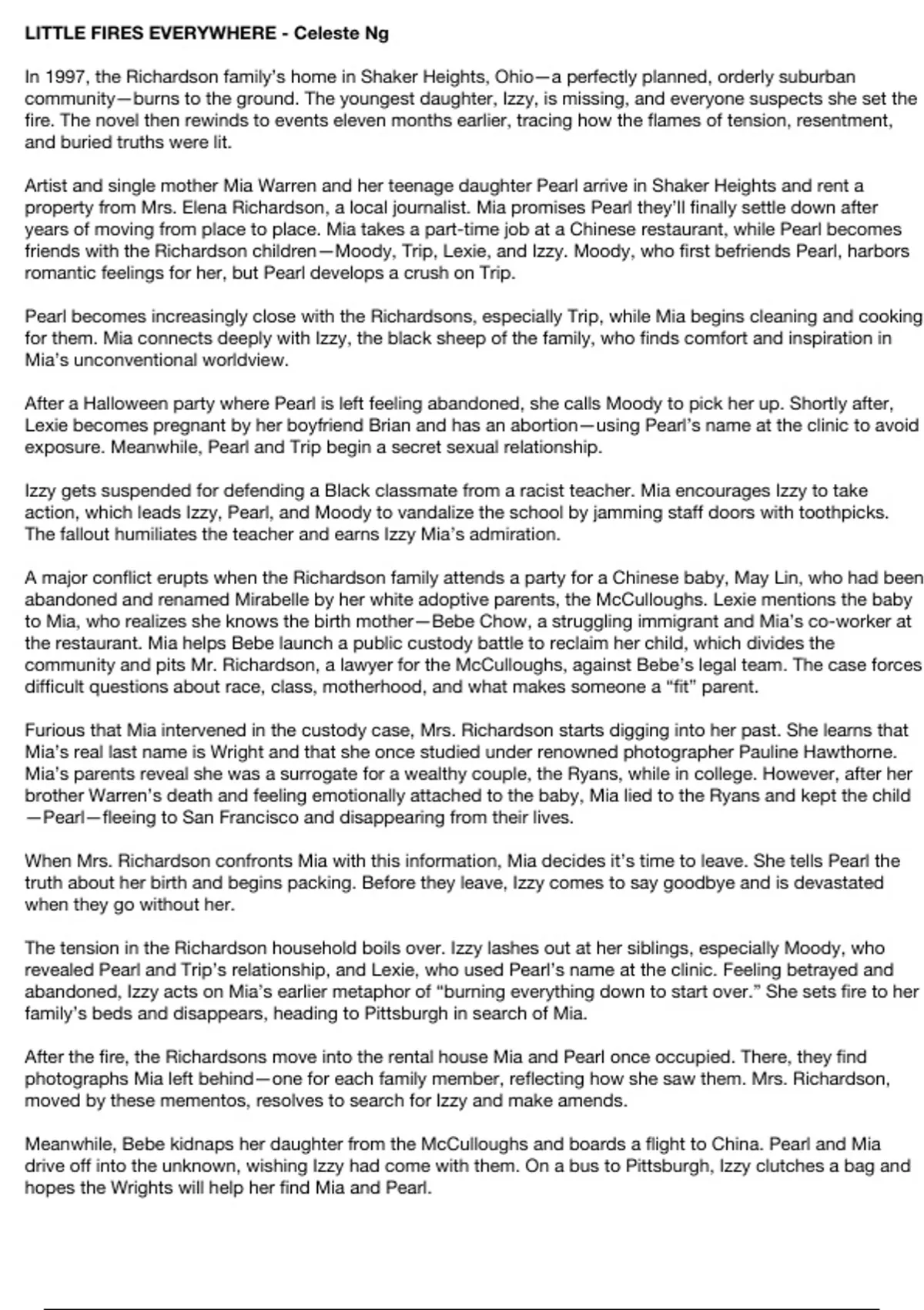 Summary ‘Little fires everywhere’ Study Note