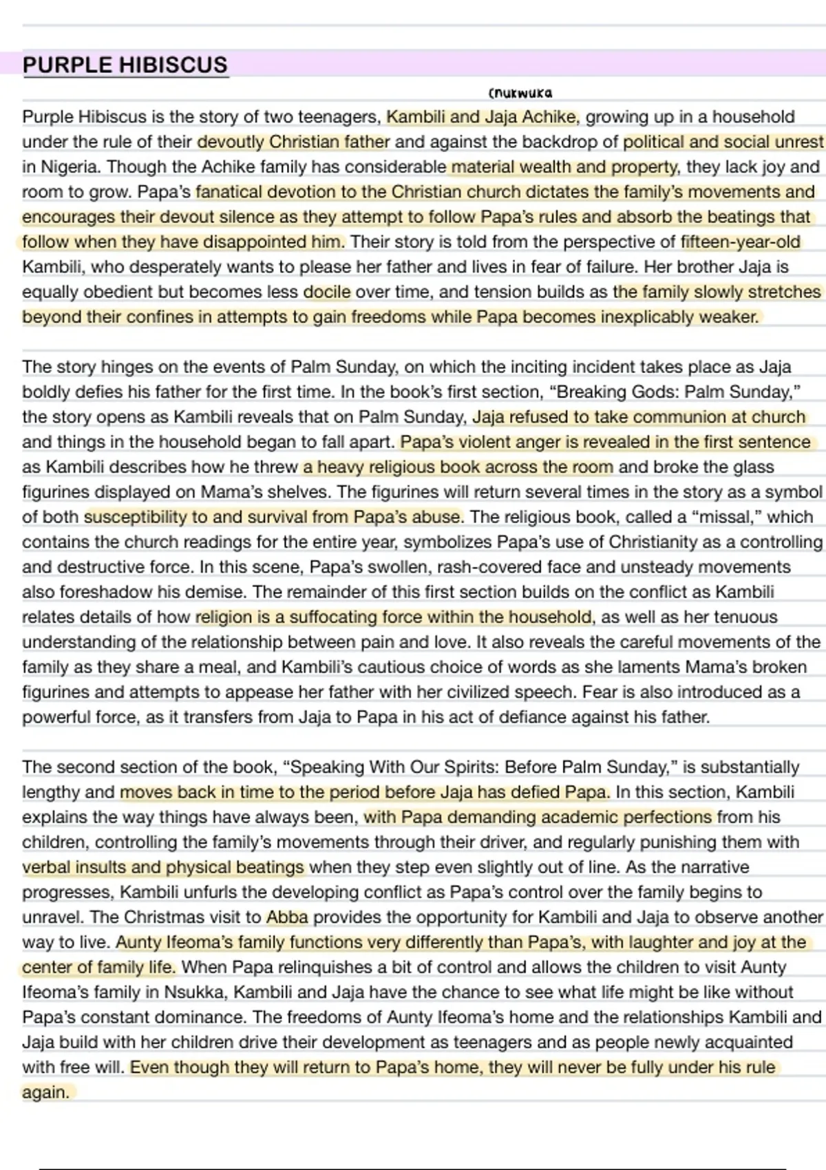 Summary ‘Purple Hibiscus’ Study Note