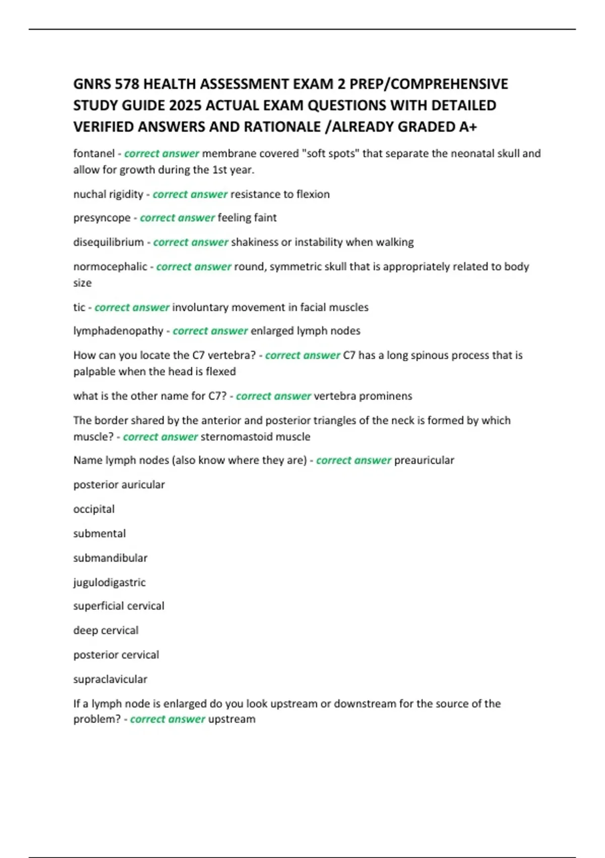 GNRS 578 HEALTH ASSESSMENT EXAM 2 PREP/COMPREHENSIVE STUDY GUIDE 2025 ACTUAL EXAM QUESTIONS WITH DETAILED VERIFIED ANSWERS AND RATIONALE /ALREADY GRADED A+