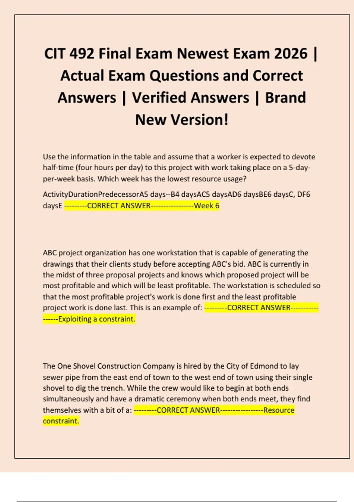 The CIT 492 Final Exam document presents a comprehensive overview of the current exam format, featuring actual questions and verified correct answers, ideal for students preparing for the 2026 exam. This new version covers essential project management concepts and methodologies, making it a valuable resource for those studying in this field. Key topics include resource usage analysis, project scheduling, and constraint management, crucial for understanding how to efficiently manage project tasks and resources. One of the primary focuses is on resource allocation, such as identifying the week with the lowest resource usage and addressing resource constraints, exemplified by The One Shovel Construction Company. Students will learn to optimize resource scheduling using strategies like exploiting constraints in project proposals. The document also delves into network representation for complex projects, simplifying network logic to highlight meaningful relationships.