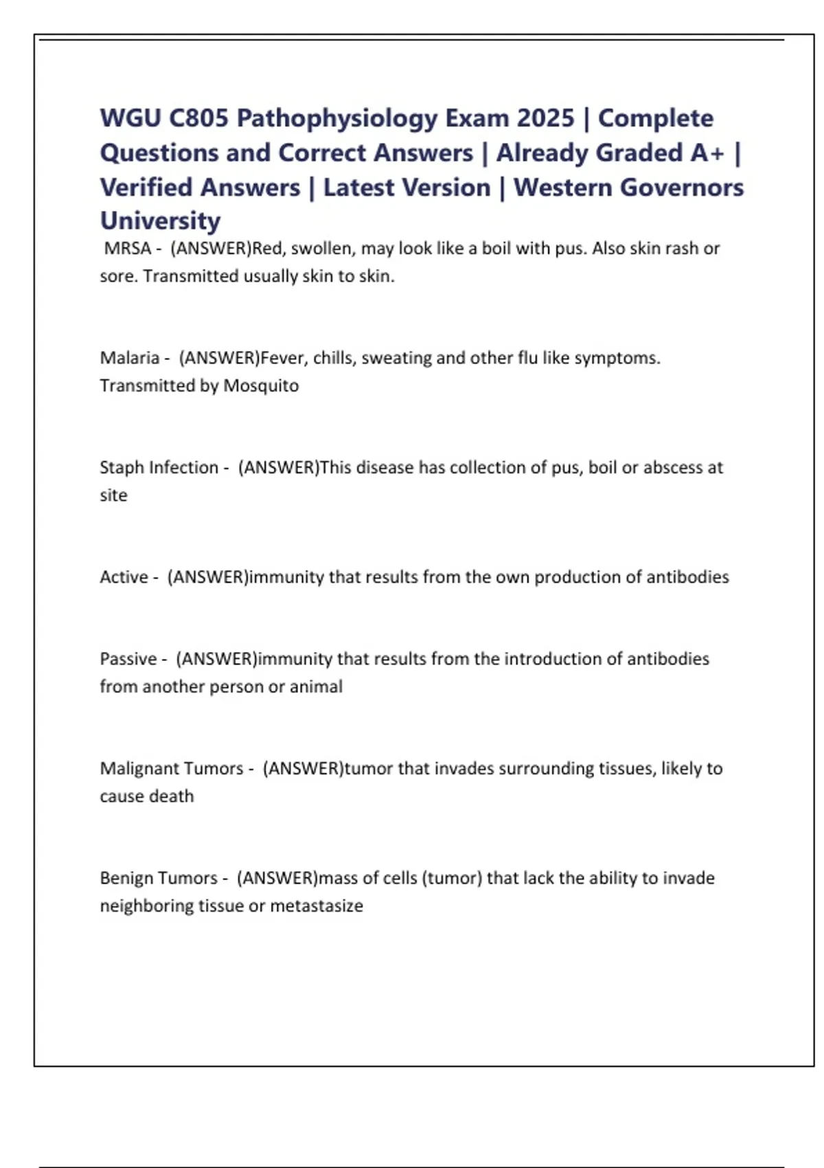WGU C805 Pathophysiology Exam 2025 | Complete Questions and Correct Answers | Already Graded A+ | Verified Answers | Latest Version | Western Governors University
