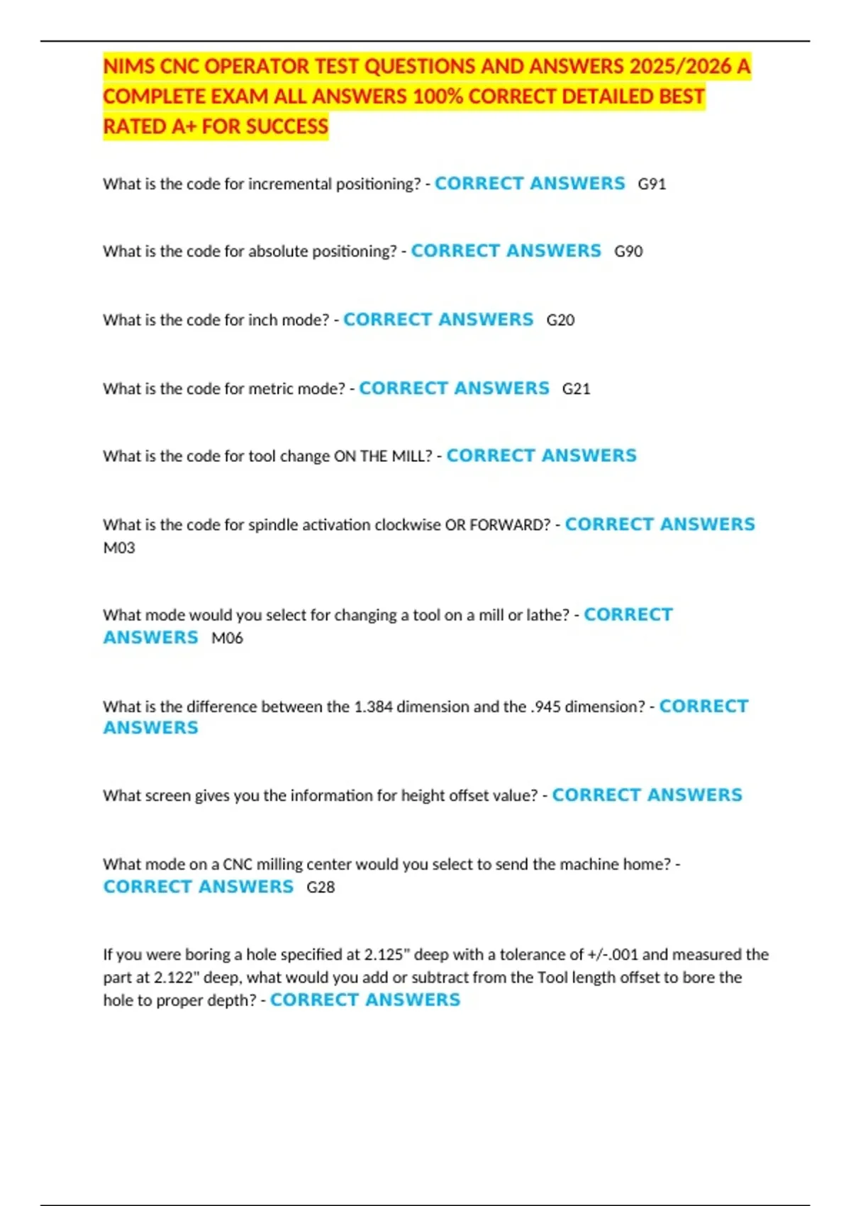 , NIMS CNC OPERATOR TEST QUESTIONS AND ANSWERS 2025/2026 A