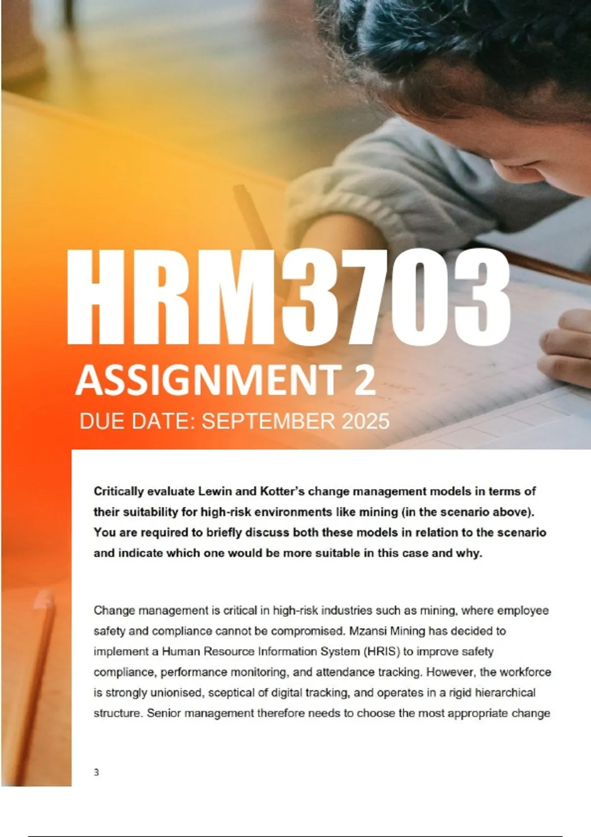 HRM3703 Assignment 2 Semester 2 2025 - Due September 2025 HRM3703 Assignment 2 2025 (Semester 2, 2025) DUE SEPTEMBER 2025 Question 1 Mzansi Mining, a mining company operating on the outskirts of Johannesburg, has decided to implement anHRIS. This poses a high risk in terms of safety and operations. In the mining environment, safety (andcompliance) is a high priority, and the company also acknowledges the importance of employees embracing andfully adopting the new system. Senior management has to decide which change management model (Lewin orKotter) will help them ensure that employees adopt and embrace the new system so that they can ensure suchcompliance. The main focus in terms of the new HRIS is safety compliance, tracking employee performance andwork attendance. Critically evaluate Lewin and Kotter’s change management models in terms of their suitability for high-risk environments like mining (in the scenario above). You are required to briefly discuss both these models in relation to the scenario and indicate which one would be more suitable in this case and why. Change management is critical in high-risk industries such as mining, where employee safety and compliance cannot be compromised. Mzansi Mining has decided to implement a Human Resource Information System (HRIS) to improve safety compliance, performance monitoring, and attendance tracking. However, the workforce