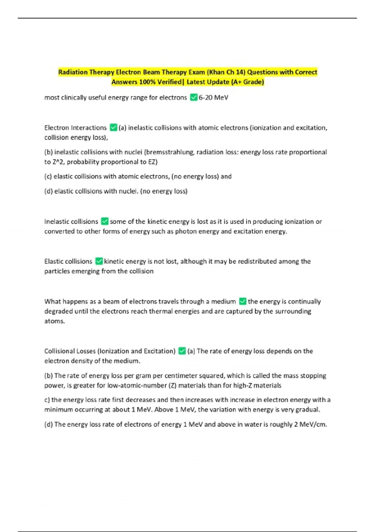 Radiation Therapy Electron Beam Therapy Exam (Khan Ch 14) Questions with Correct Answers 100% Verified| Latest Update (A+ Grade)