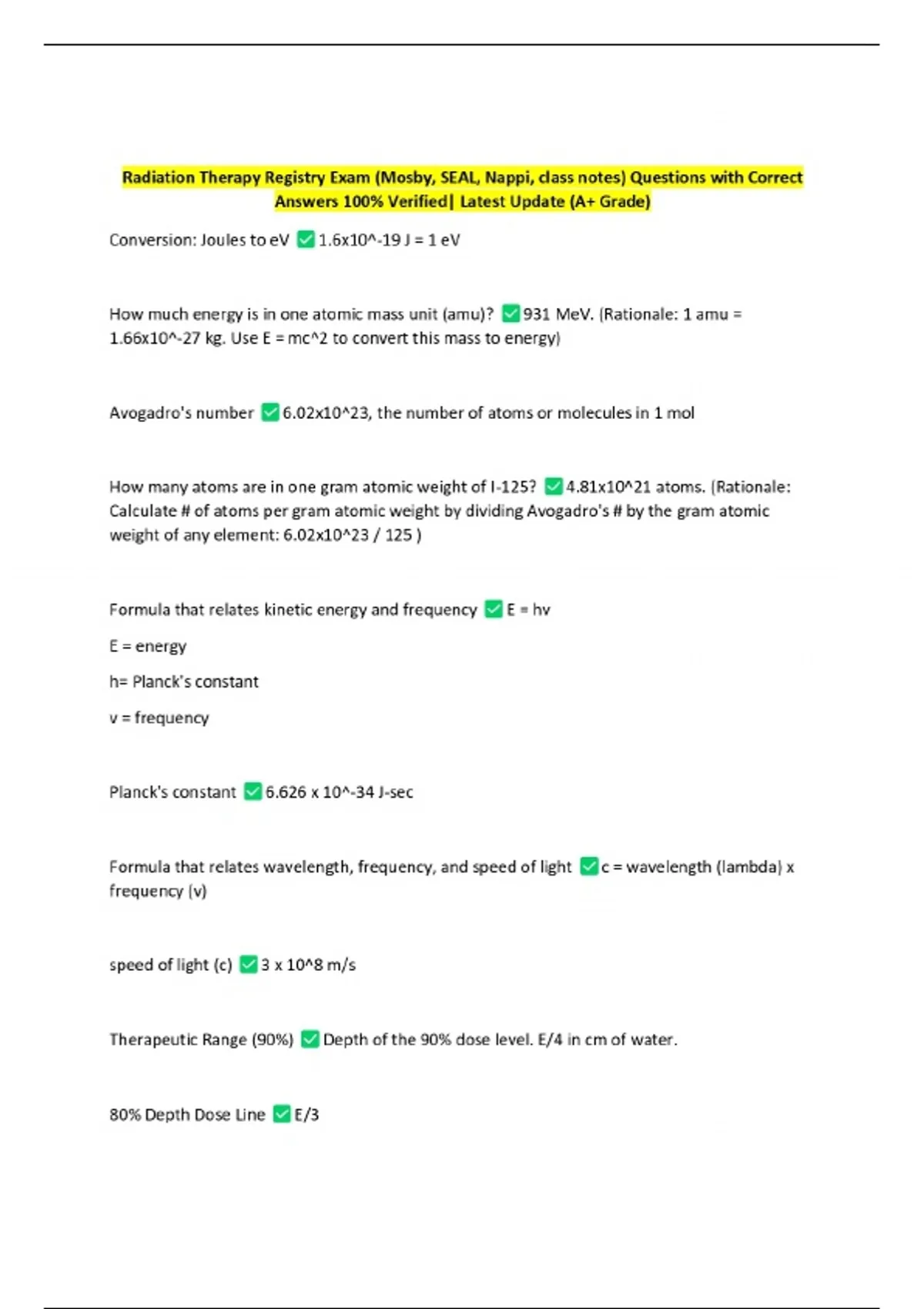 Radiation Therapy Registry Exam (Mosby, SEAL, Nappi, class notes) Questions with Correct Answers 100% Verified| Latest Update (A+ Grade)