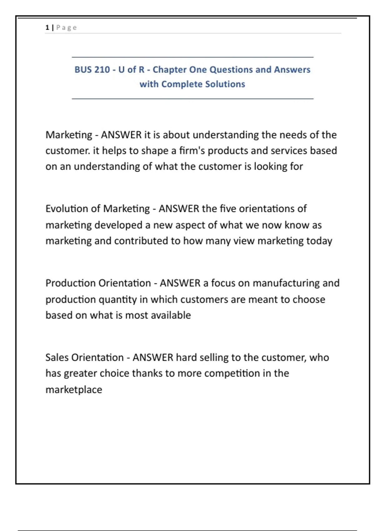 BUS 210 - U of R - Chapter One Questions and Answers