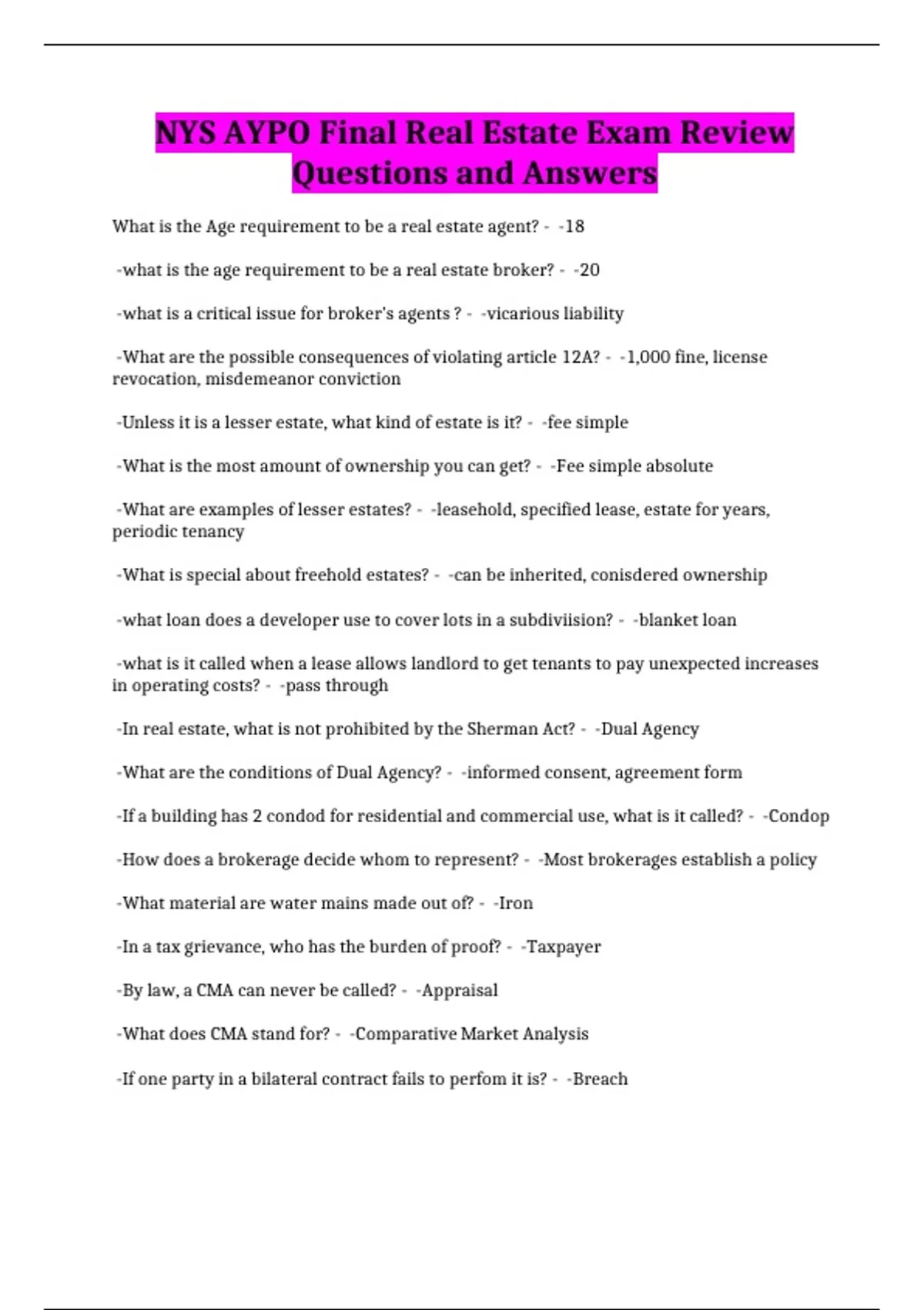NYS AYPO Final Real Estate Exam Review