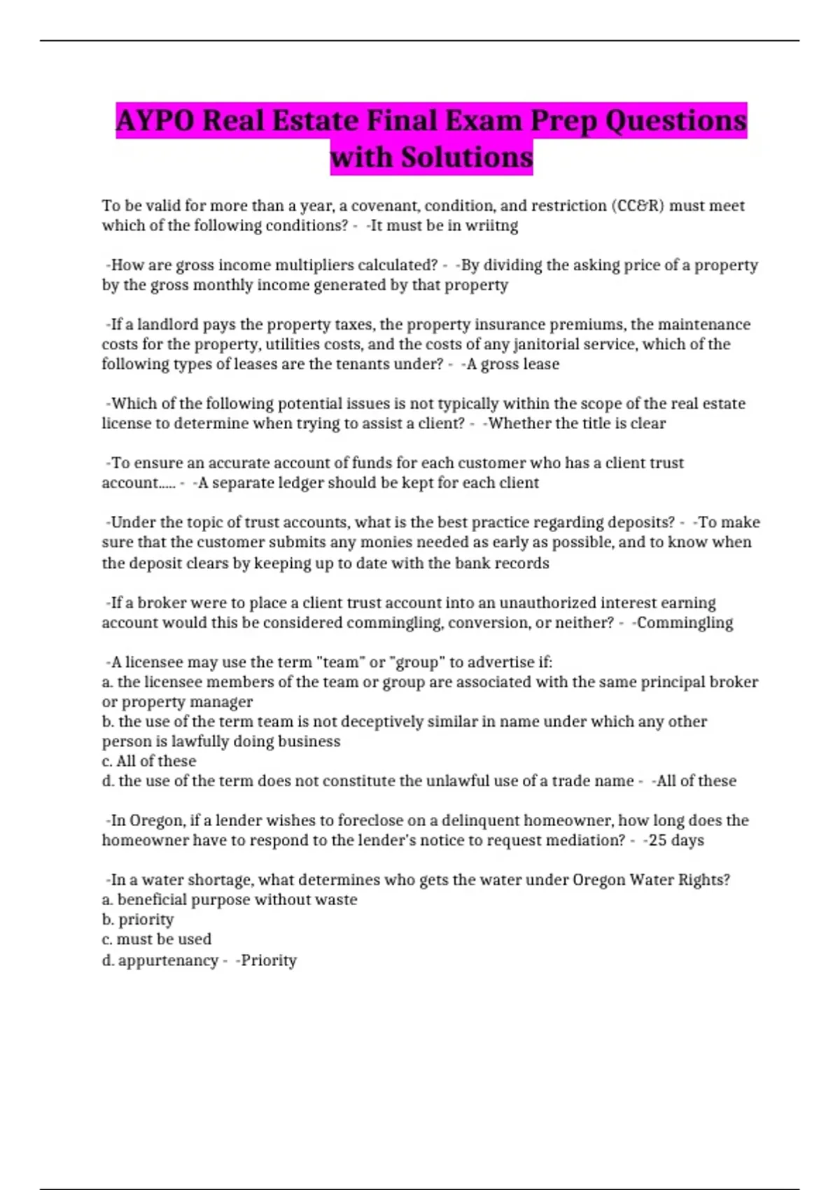 AYPO Real Estate Final Exam Prep Questions