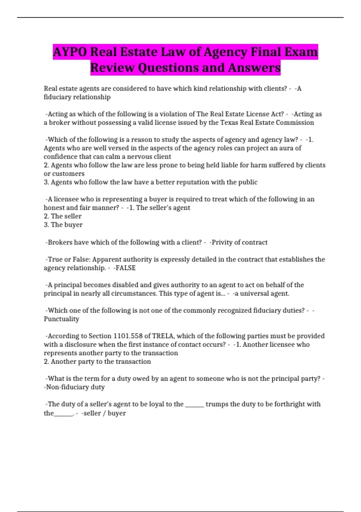 AYPO Real Estate Law of Agency Final Exam