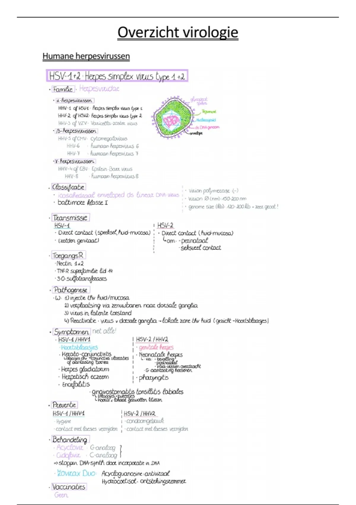 Volledige samenvatting van Virologie van professor Dominique Schols. Compleet met ALLE besproken virussen, tekeningen van de virion van herpes, influenza, HIV, HBV en de replicatiecycli van HIV, influenza,HCV. Alles digitaal uitgeschreven in een overzichtelijke structuur.