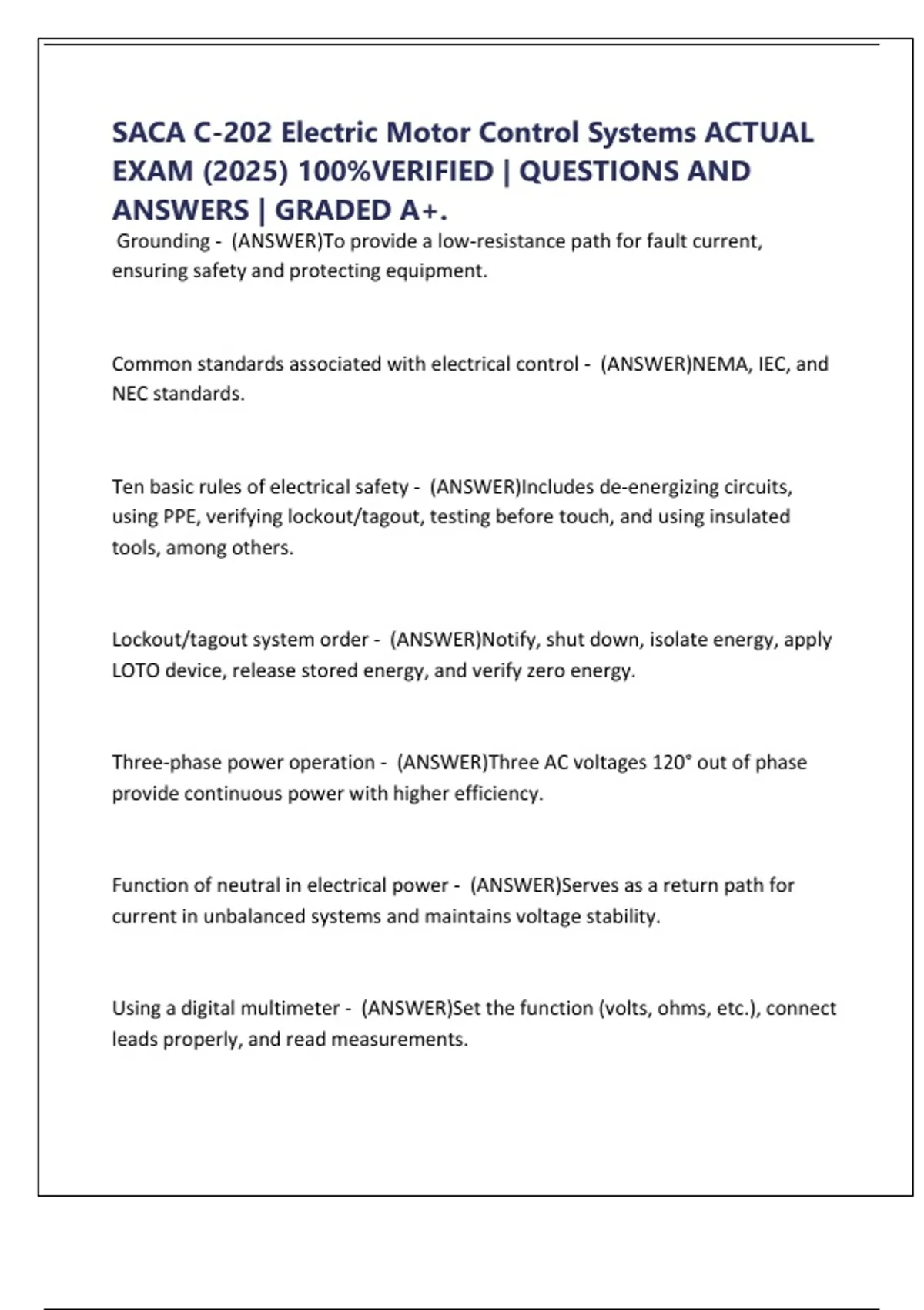 SACA C-202 Electric Motor Control Systems ACTUAL EXAM (2025) 100%VERIFIED | QUESTIONS AND ANSWERS | GRADED A+.