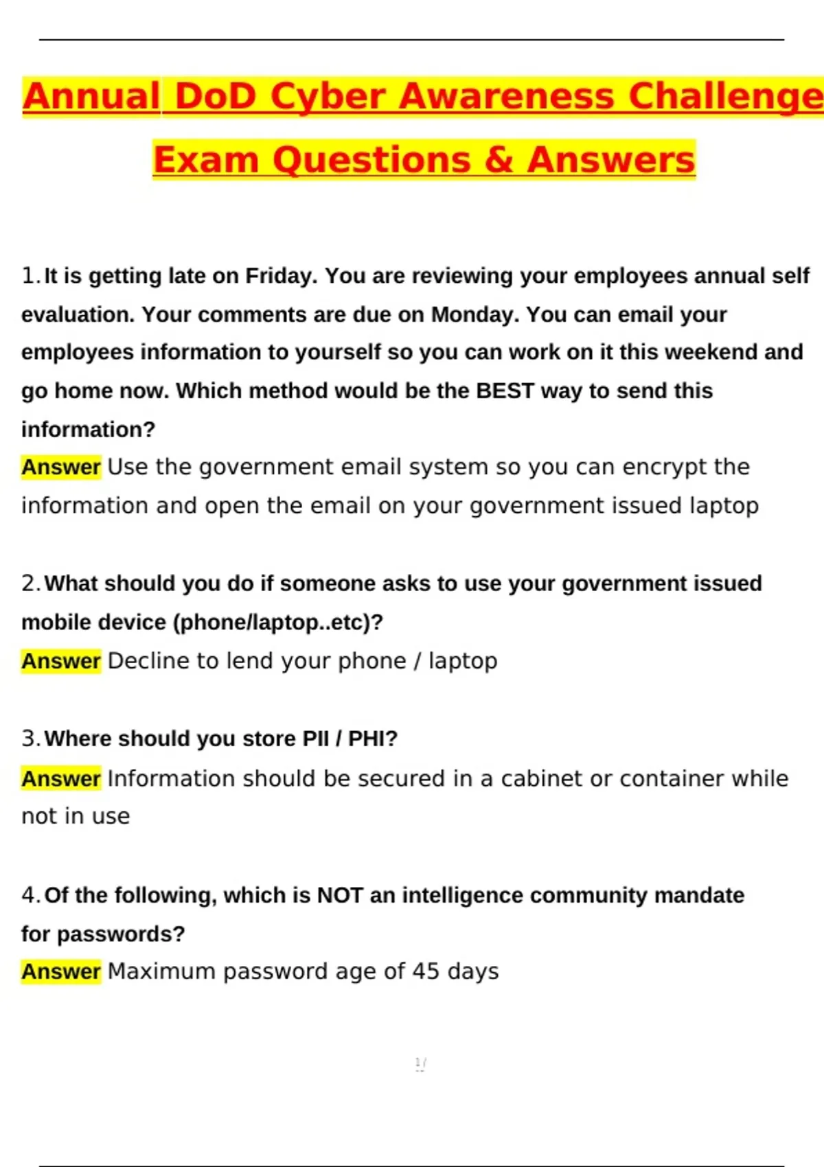 Annual DoD Cyber Awareness Challenge Exam (Latest 2025 / 2026 Update) Questions and Verified Answers | 100% Correct | Grade A+