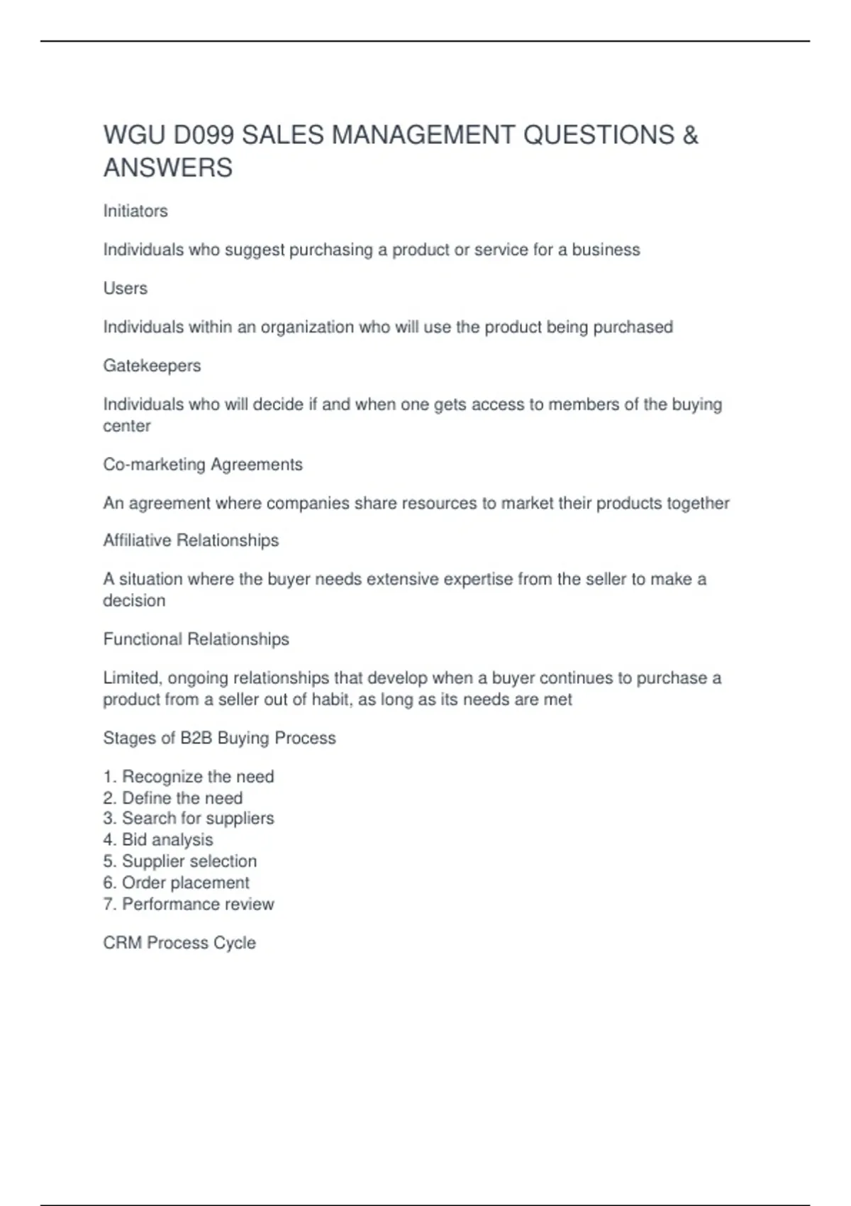 WGU D099 SALES MANAGEMENT QUESTIONS &