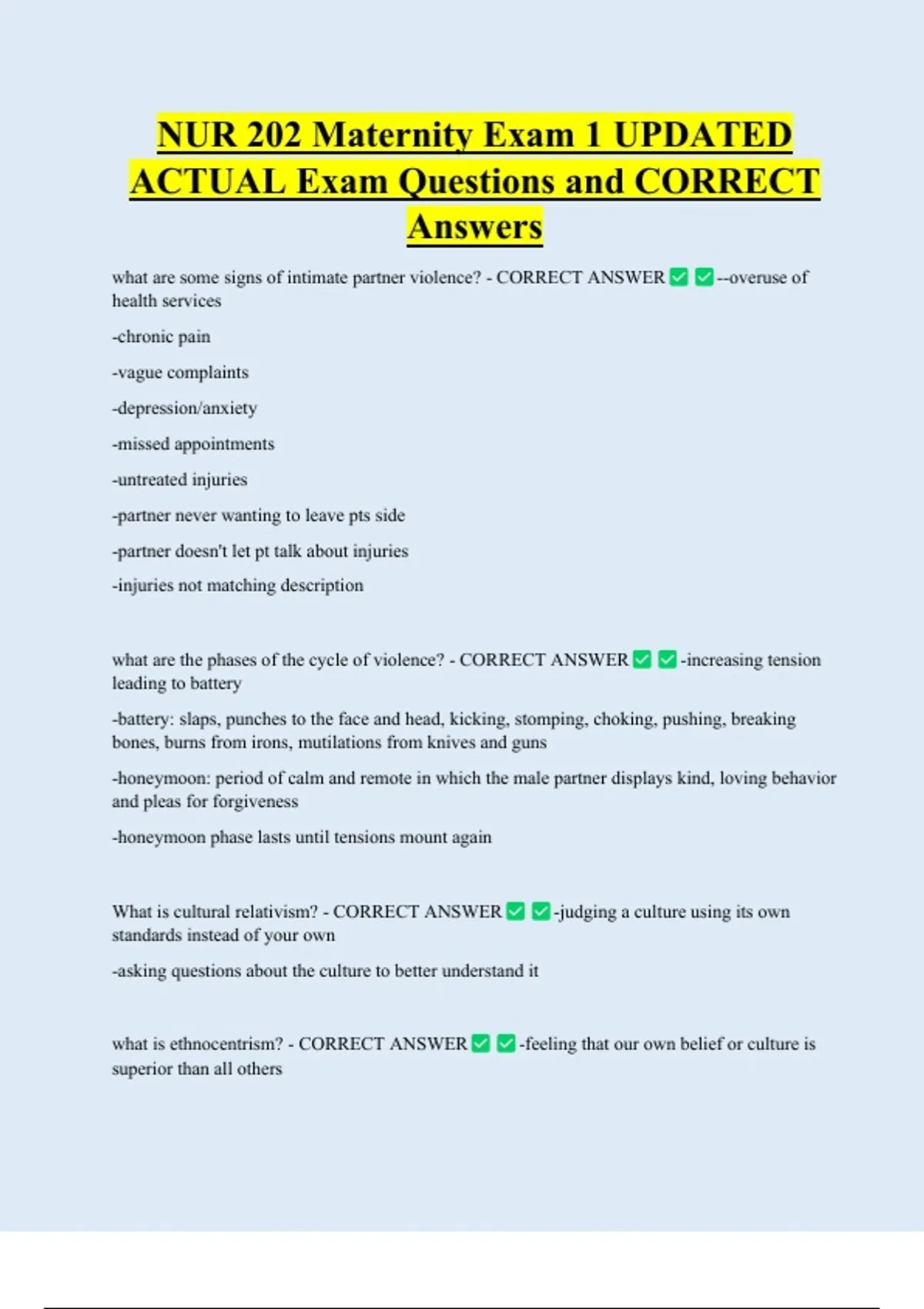 NUR 202 Maternity Exam 1 UPDATED ACTUAL Exam Questions and CORRECT Answers what are some signs of intimate partner violence? - CORRECT ANSWER health services -chronic pain -vague complaints -depression/anxiety -missed appointments -untreated injuries -partner never wanting to leave pts side -partner doesn't let pt talk about injuries -injuries not matching descr