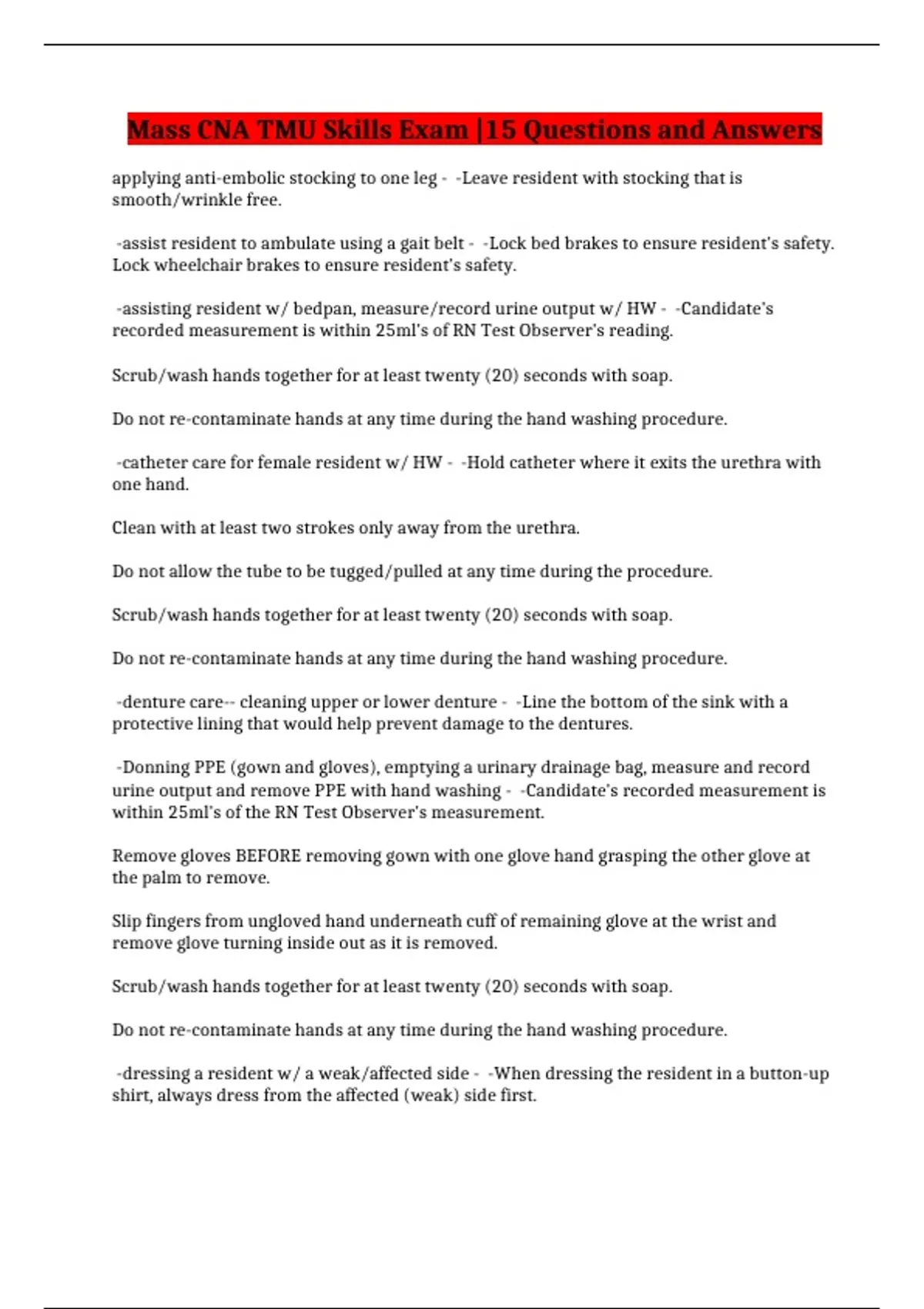 Mass CNA TMU Skills Exam |15 Questions and Answers