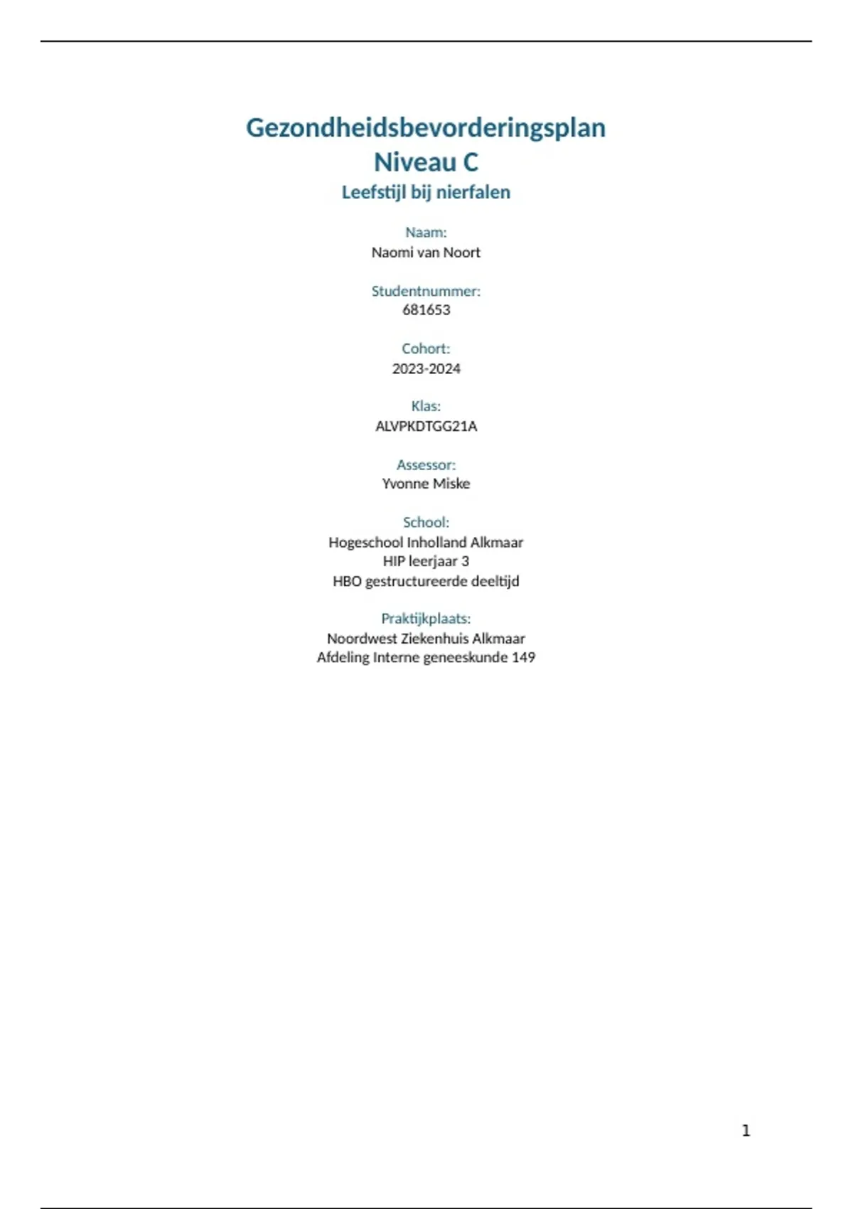Dit verslag is geschreven voor de eenheid van leeruitkomst gezondheidsbevordering niveau C. Aan de hand van het ziektebeeld nierfalen worden de kernbegrippen preventiegericht analyseren, gezond gedrag bevorderen en persoonsgerichte communicatie uitgewerkt en aangetoond.