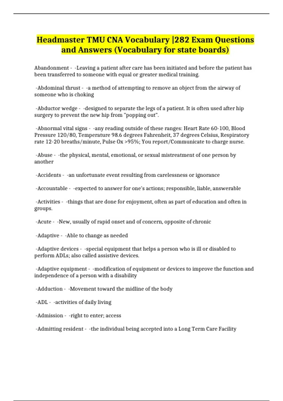 Headmaster TMU CNA Vocabulary |282 Exam Questions