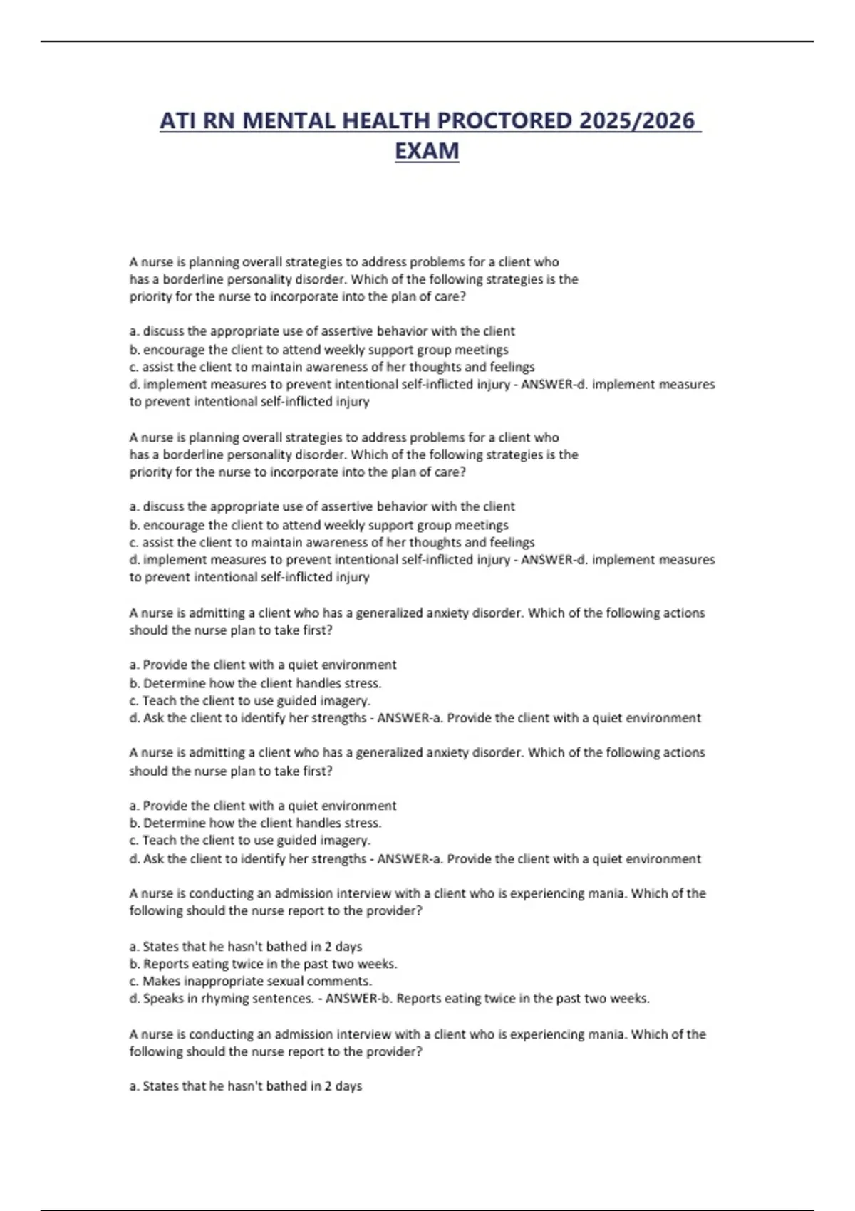 ATI RN MENTAL HEALTH PROCTORED 2025/2026