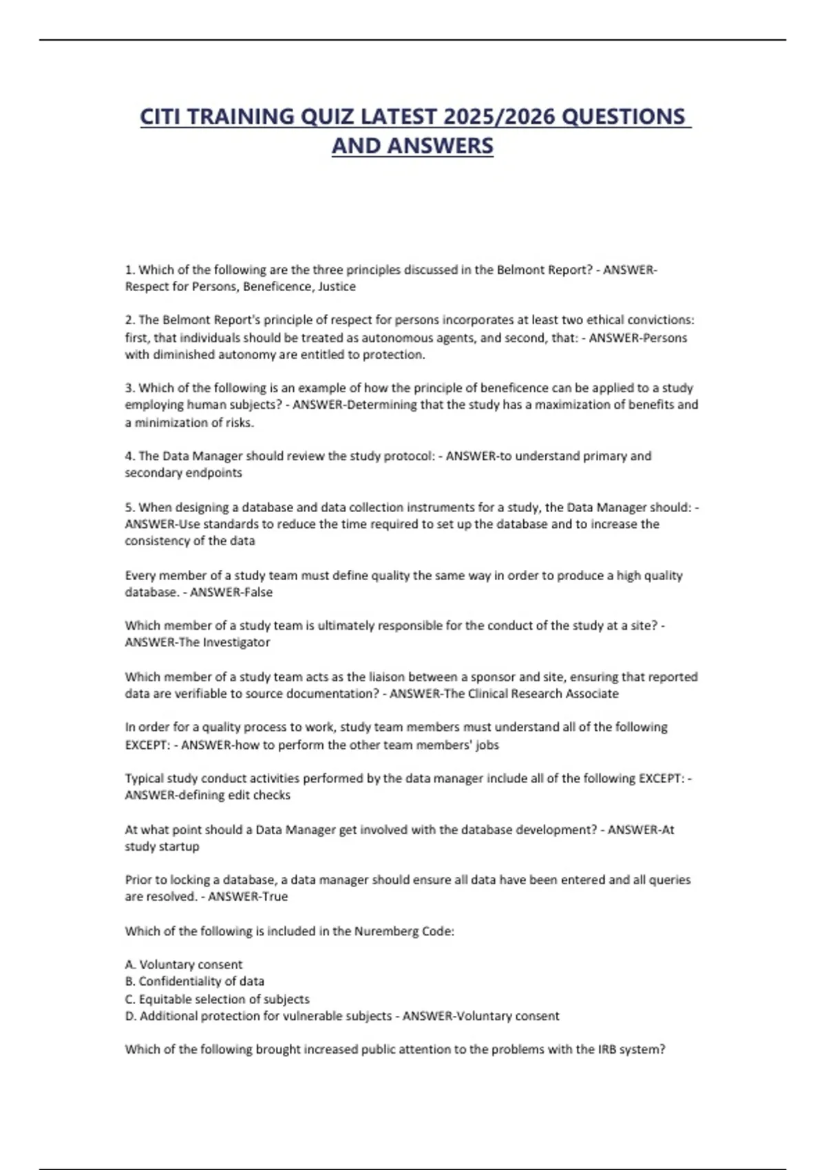 CITI TRAINING QUIZ LATEST 2025/2026 QUESTIONS