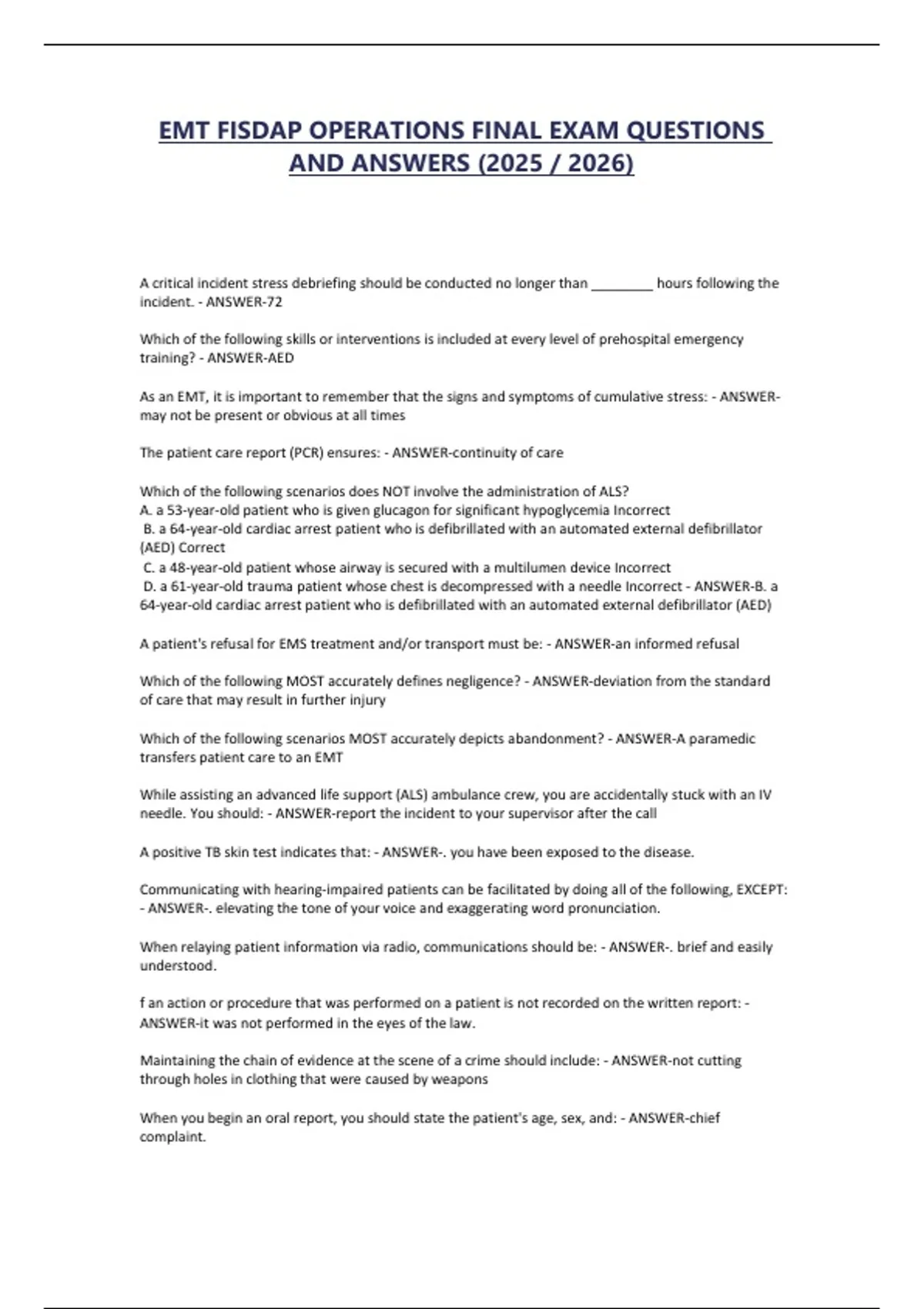 EMT FISDAP OPERATIONS FINAL EXAM QUESTIONS
