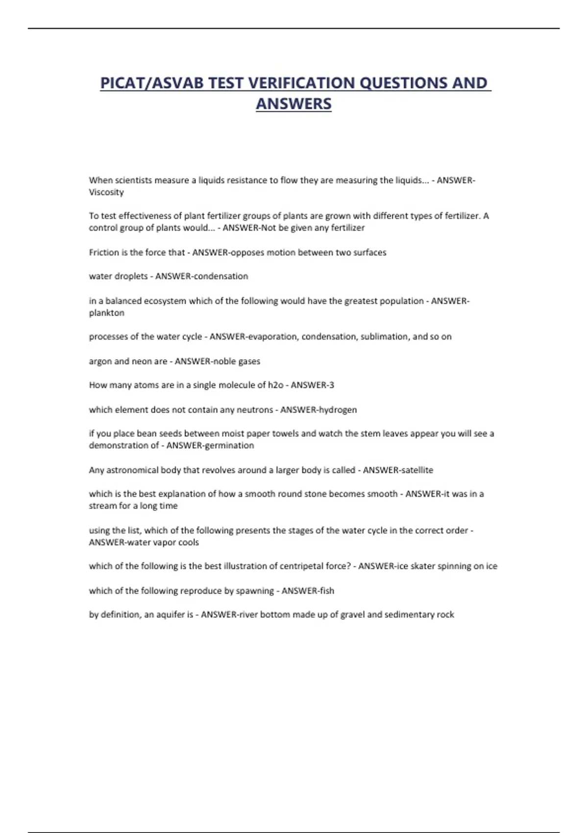 PICAT/ASVAB TEST VERIFICATION QUESTIONS AND