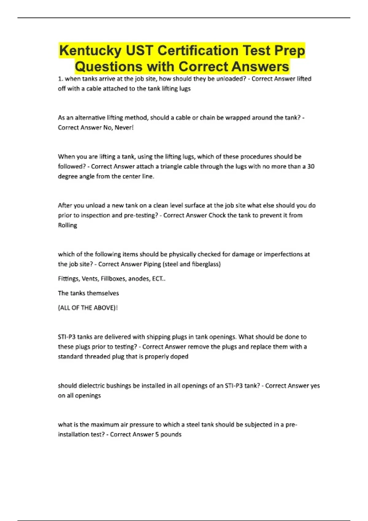 Kentucky UST Certification Test Prep Questions with Correct Answers 1. when tanks arrive at the job site, how should they be unloaded? - Correct Answer lifted off with a cable attached to the tank lifting lugs As an alternative lifting method, should a cable or chain be wrapped around the tank? - Correct Answer No, Never! When you are lifting a tank, using the lifting lugs, which of these procedures should be followed? - Correct Answer attach a triangle cable through the lugs with no more than a 30 degree angle from the center line. After you unload a new tank on a clean level surface at the job site what else should you do prior to inspection and pre-testing? - Correct Answer Chock the tank to prevent it from Rolling which of the following items should be physically checked for damage or imperfections at the job site? - Correct Answer Piping (steel and fiberglass) Fittings, Vents, Fillboxes, anodes, ECT.. The tanks themselves (ALL OF THE ABOVE)! STI-P3 tanks are delivered with shipping plugs in tank openings. What should be done to these plugs prior to testing? - Correct Answer remove the plugs and replace them with a standard threaded plug that is properly doped should dielectric bushings be installed in all openings of an STI-P3 tank? - Correct Answer yes on all openings what is the maximum air pressure to which a steel tank should be subjected in a pre-installation test? - Correct Answer 5 pounds for fiberglass reinforced plastic (FRP) tanks up to 12 feet in diameter what is an acceptable air pressure to which the tanks may be subjected in a pre-installation test? - Correct Answer 3 pounds for FRP tanks over 12 feet in diameter what is the maximum air pressure to which the tanks should be subjected in a pre-installation test? - Correct Answer 3 pounds when you are conducting an air test on a tank the type of gauge that should be used is? - Correct Answer a pressure gauge with a maximum limit of 10 to 15 PSIG the proper procedure for conducting a pre-installation air test of a steel tank is to? - Correct Answer apply 3 to 5 pounds of pressure and soap all surfaces and weld seams visible through the coating while inspecting for bubbles. what is the proper procedure for conducting a pre-installation air test of an FRP tank Under 12 feet in diameter is to.... - Correct Answer apply 3 pounds of air pressure and soap all surfaces while inspecting for any sign of a leak either audible or visible in the form of bubbles on the surface a double-walled steel tank build in accordance with UL standard 58 is? - Correct Answer requires air testing of the interstitial space prior to installation the proper procedure for conducting a pre-installation air test of a double-walled tank is to? - Correct Answer pressurize the inner tank monitor the pressure for one hour and then pressurize the space between the inner and outer tanks with