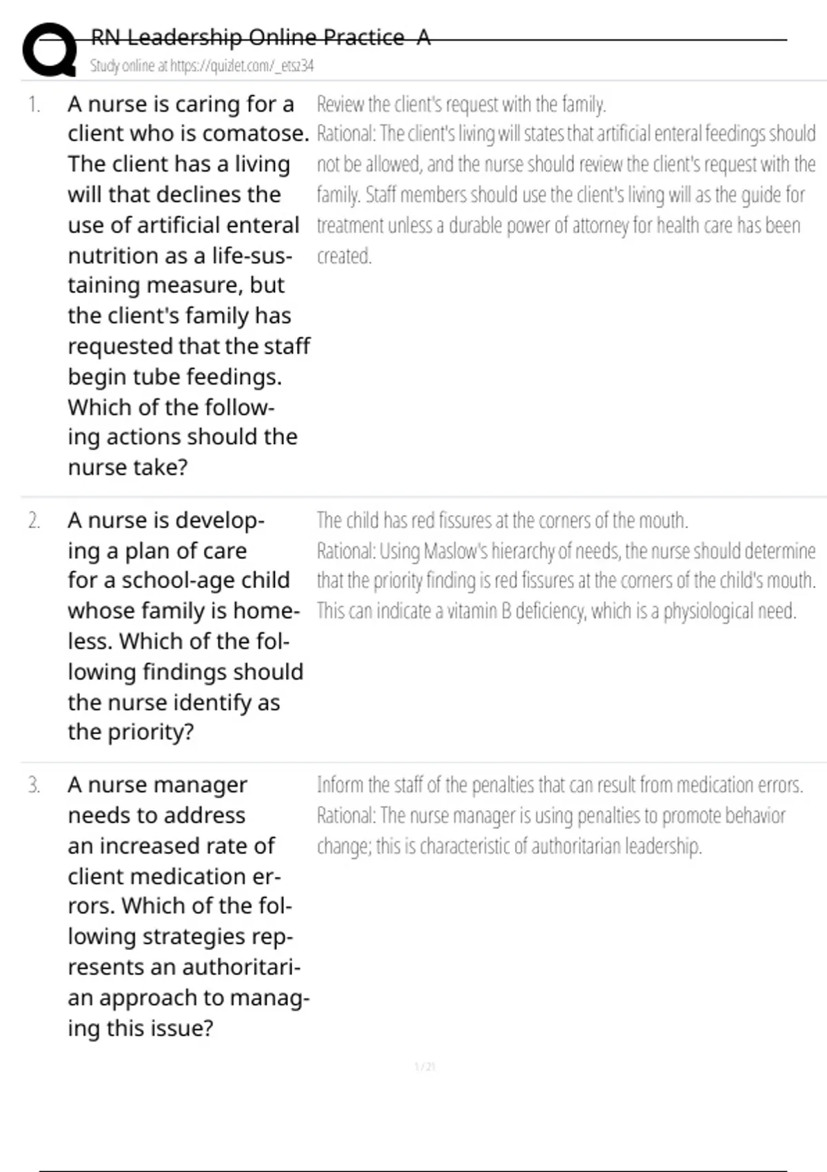 , RN Leadership Online Practice A