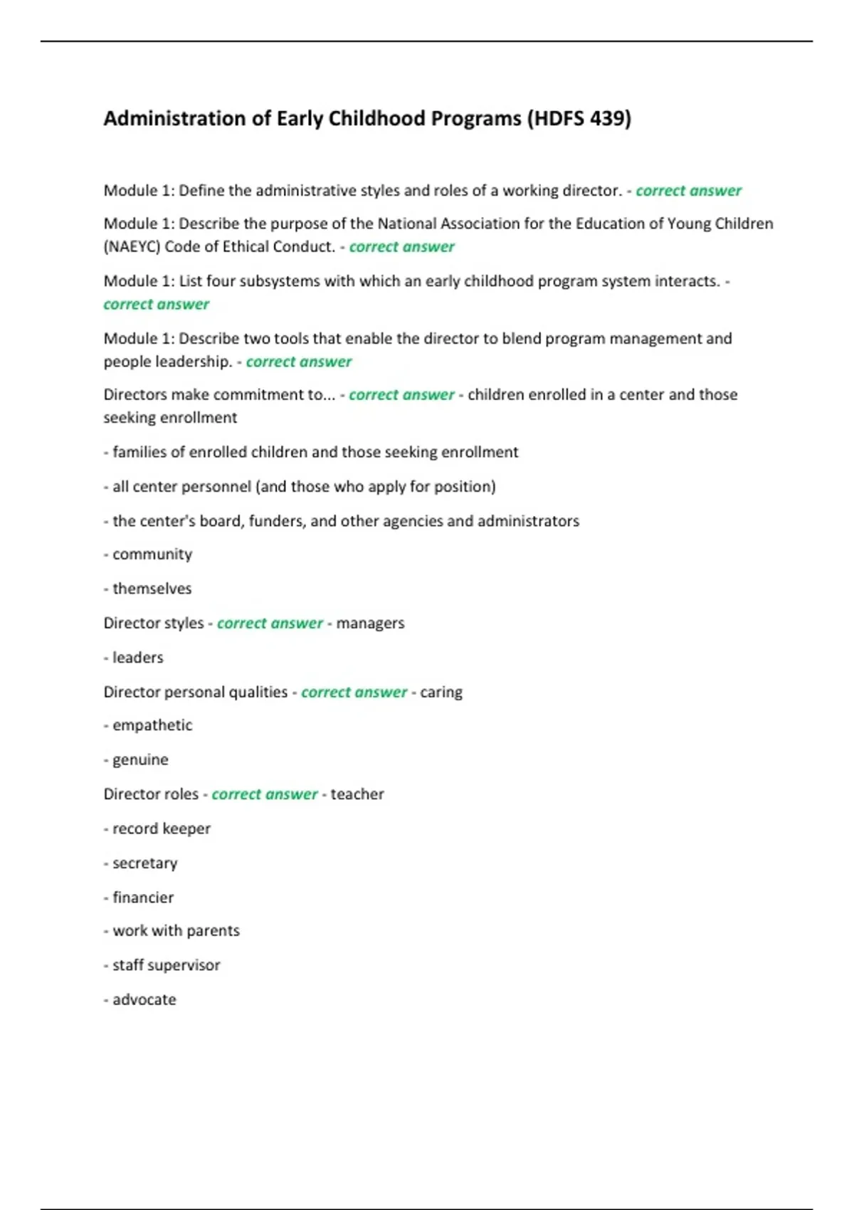 Module 1: Define the administrative styles and roles of a working director. - correct answer Module 1: Describe the purpose of the National Association for the Education of Young Children (NAEYC) Code of Ethical Conduct. - correct answer Module 1: List four subsystems with which an early childhood program system interacts. - correct answer Module 1: Describe two tools that enable the director to blend program management and people leadership. - correct answer Directors make commitment to... - correct answer - children enrolled in a center and those seeking enrollment - families of enrolled children and those seeking enrollment