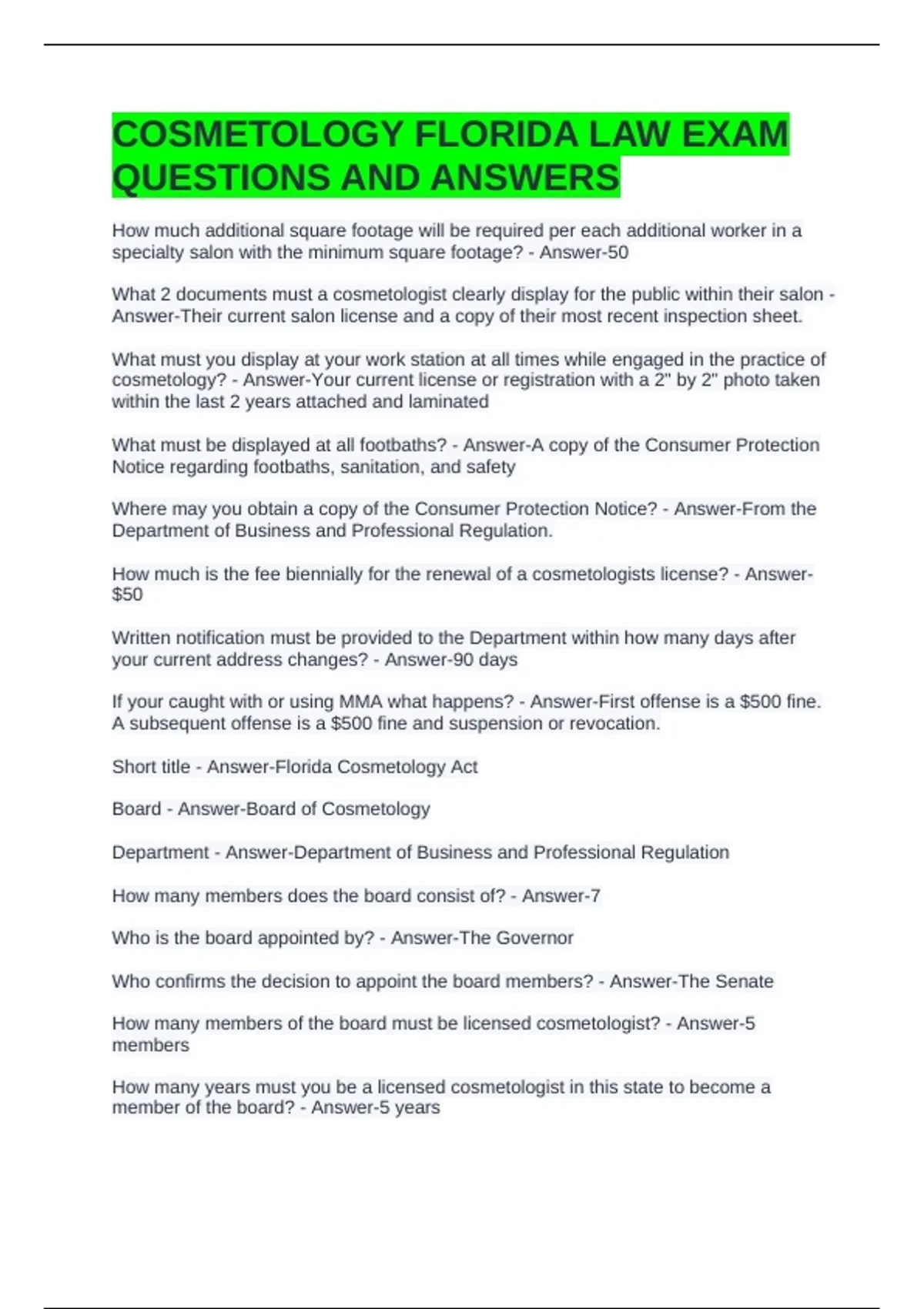 COSMETOLOGY FLORIDA LAW EXAM QUESTIONS AND ANSWERS How much additional square footage will be required per each additional worker in a specialty salon with the minimum square footage? - Answer-50 What 2 documents must a cosmetologist clearly display for the public within their salon - Answer-Their current salon license and a copy of their most recent inspection sheet. What must you display at your work station at all times while engaged in the practice of cosmetology? - Answer-Your current license or registration with a 2" by 2" photo taken within the last 2 years attached and laminated What must be displayed at all footbaths? - Answer-A copy of the Consumer Protection Notice regarding footbaths, sanitation, and safety Where may you obtain a copy of the Consumer Protection Notice? - Answer-From the Department of Business and Professional Regulation. How much is the fee biennially for the renewal of a cosmetologists license? - Answer-$50 Written notification must be provided to the Department within how many days after your current address changes? - Answer-90 days If your caught with or using MMA what happens? - Answer-First offense is a $500 fine. A subsequent offense is a $500 fine and suspension or revocation. Short title - Answer-Florida Cosmetology Act Board - Answer-Board of Cosmetology Department - Answer-Department of Business and Professional Regulation How many members does the board consist of? - Answer-7 Who is the board appointed by? - Answer-The Governor Who confirms the decision to appoint the board members? - Answer-The Senate How many members of the board must be licensed cosmetologist? - Answer-5 members How many years must you be a licensed cosmetologist in this state to become a member of the board? - Answer-5 years
