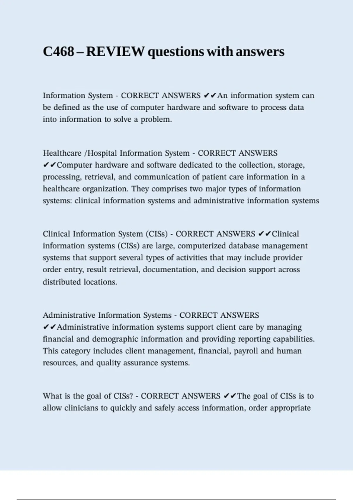 Healthcare /Hospital Information System - CORRECT ANSWERS