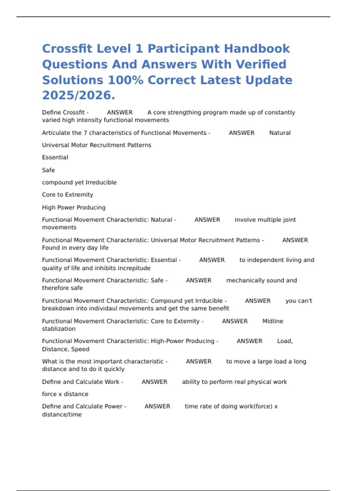 Crossfit Level 1 Participant Handbook Questions And Answers With Verified Solutions 100% Correct Latest Update 2025/2026.