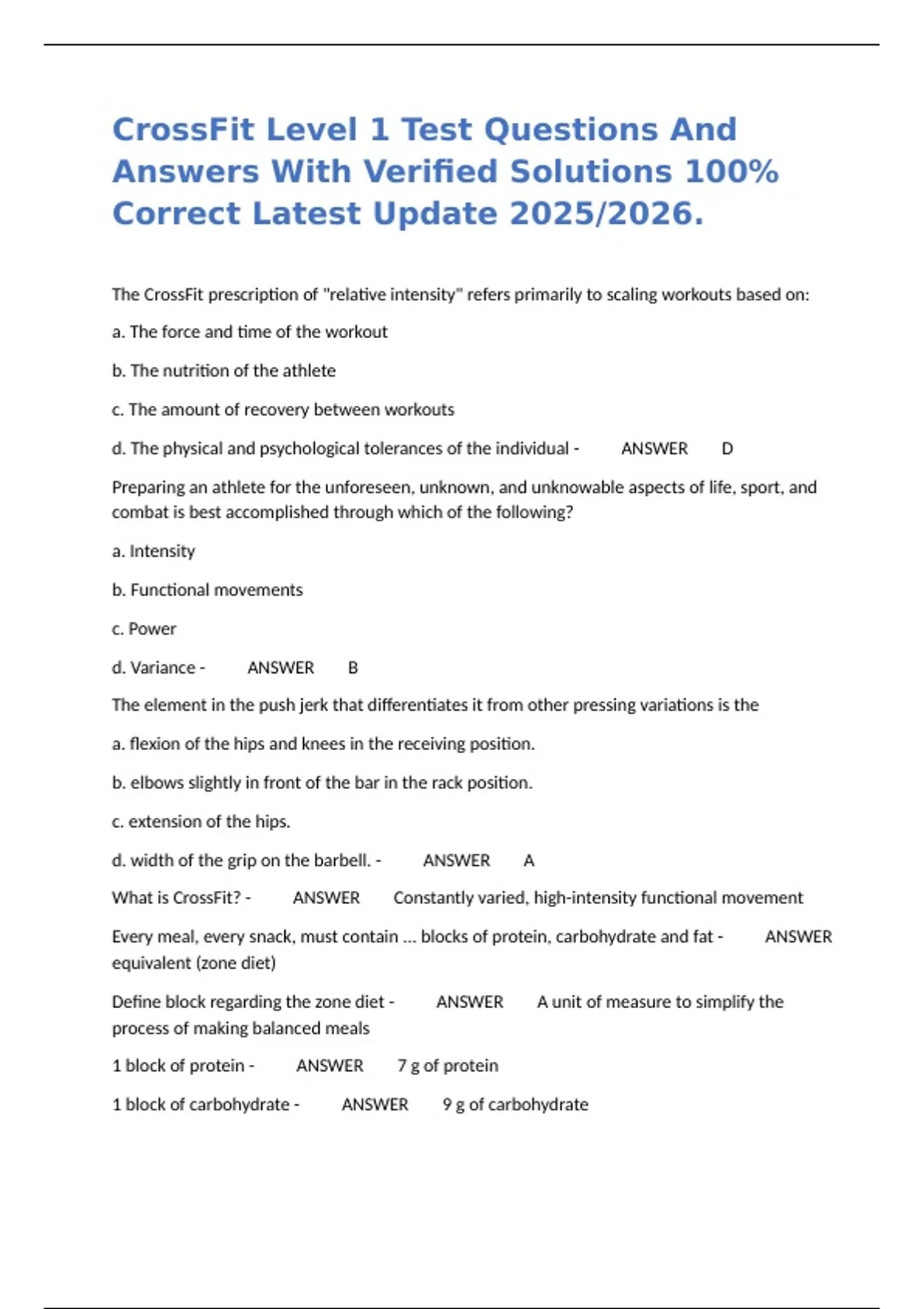 CrossFit Level 1 Test Questions And Answers With Verified Solutions 100% Correct Latest Update 2025/2026.
