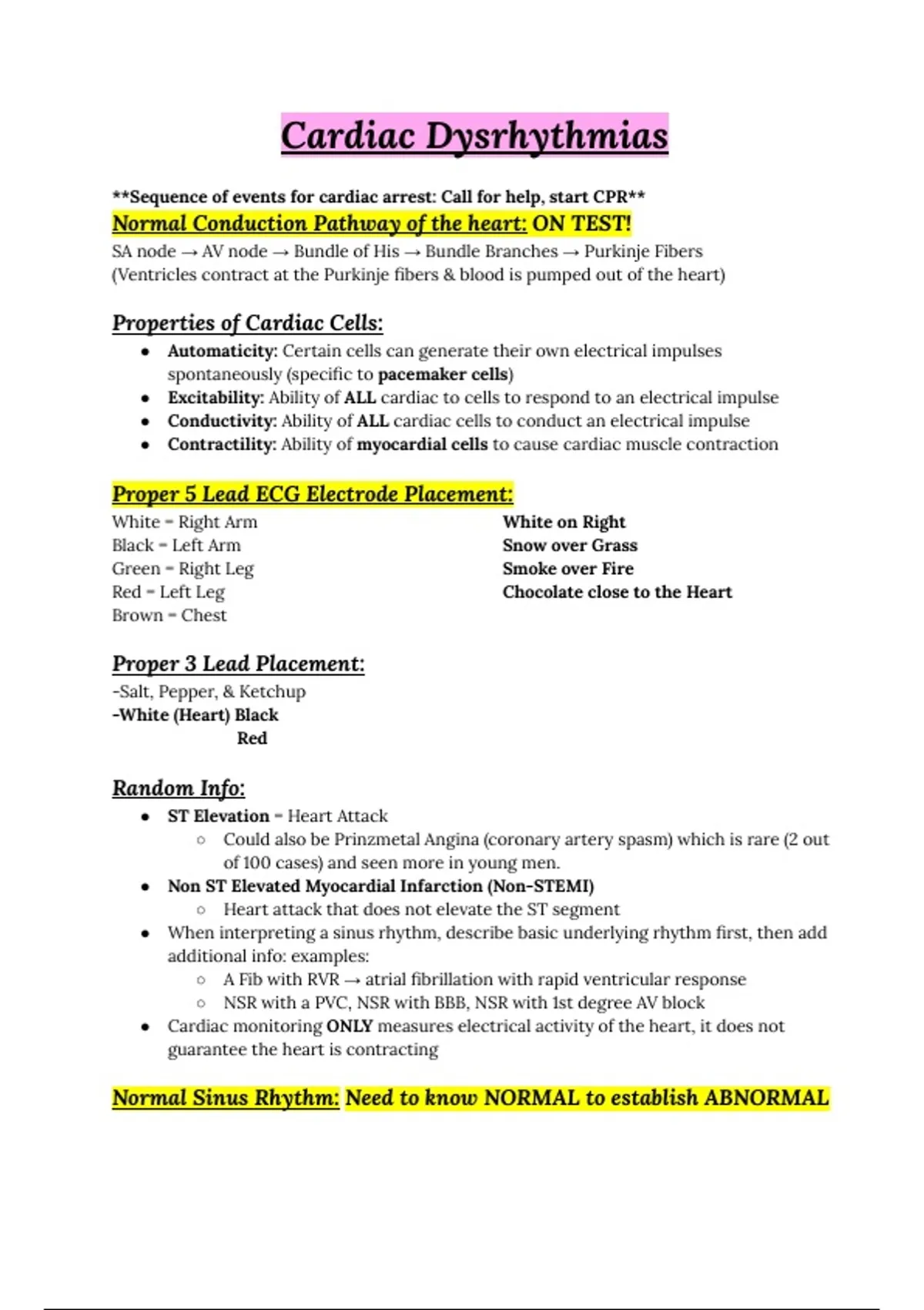 Detailed but condensed notes on common cardiac dysrhythmias, including causes, ECG characteristics, nursing interventions & treatments. Perfect for rhythm interpretation practice.