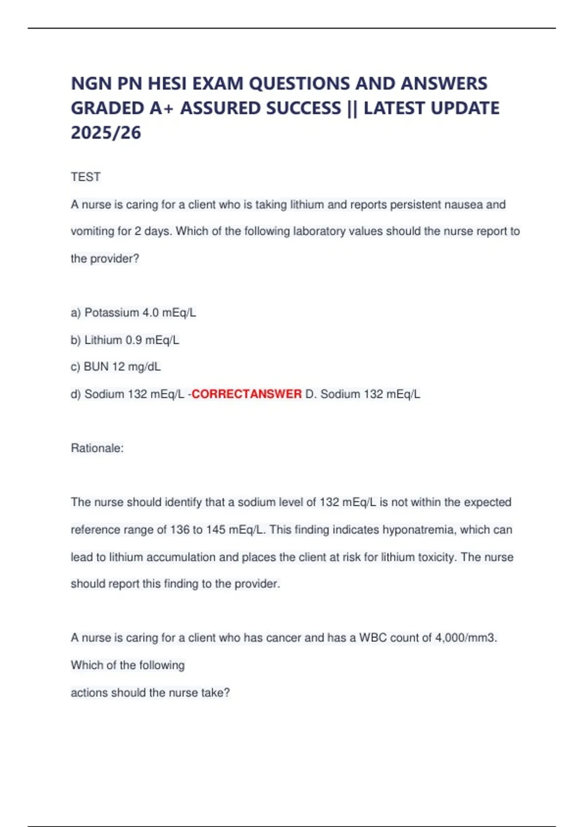 d) Sodium 132 mEq/L -CORRECTANSWER D. Sodium 132 mEq/L