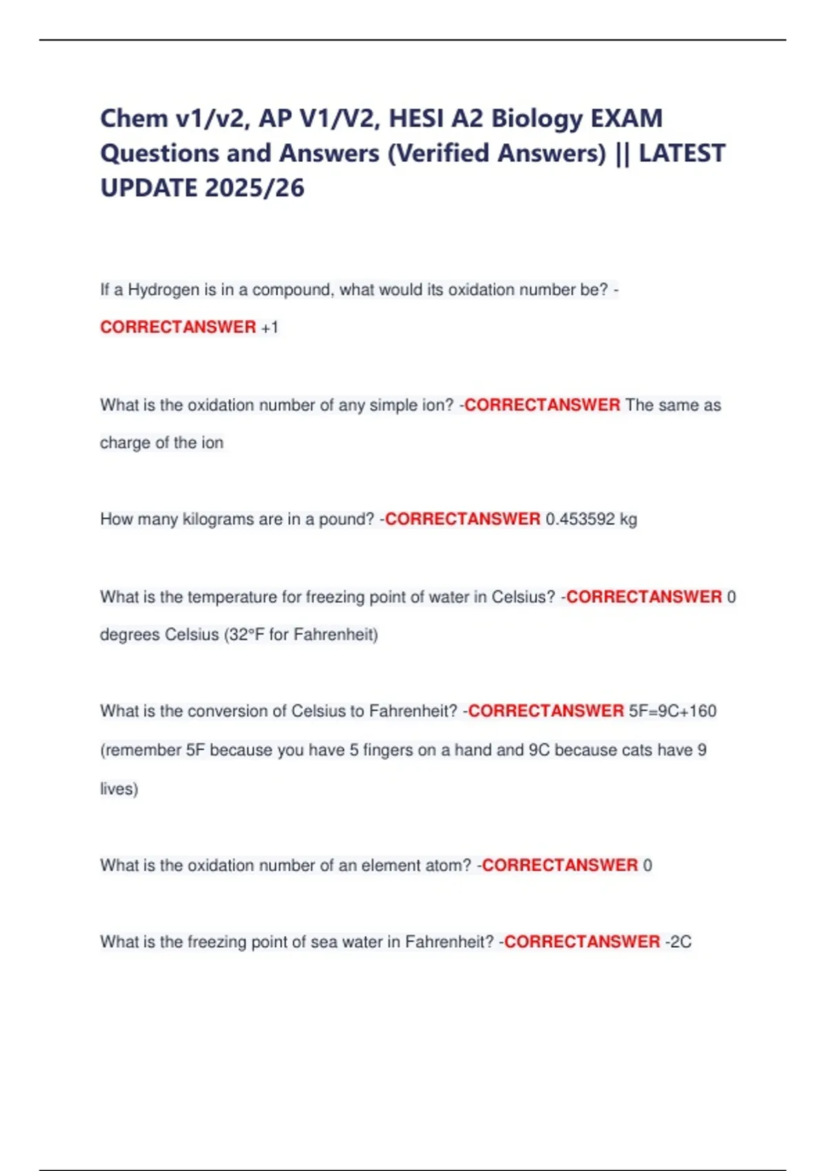 Chem v1/v2, AP V1/V2, HESI A2 Biology EXAM Questions and Answers (Verified Answers) || LATEST UPDATE 2025/26